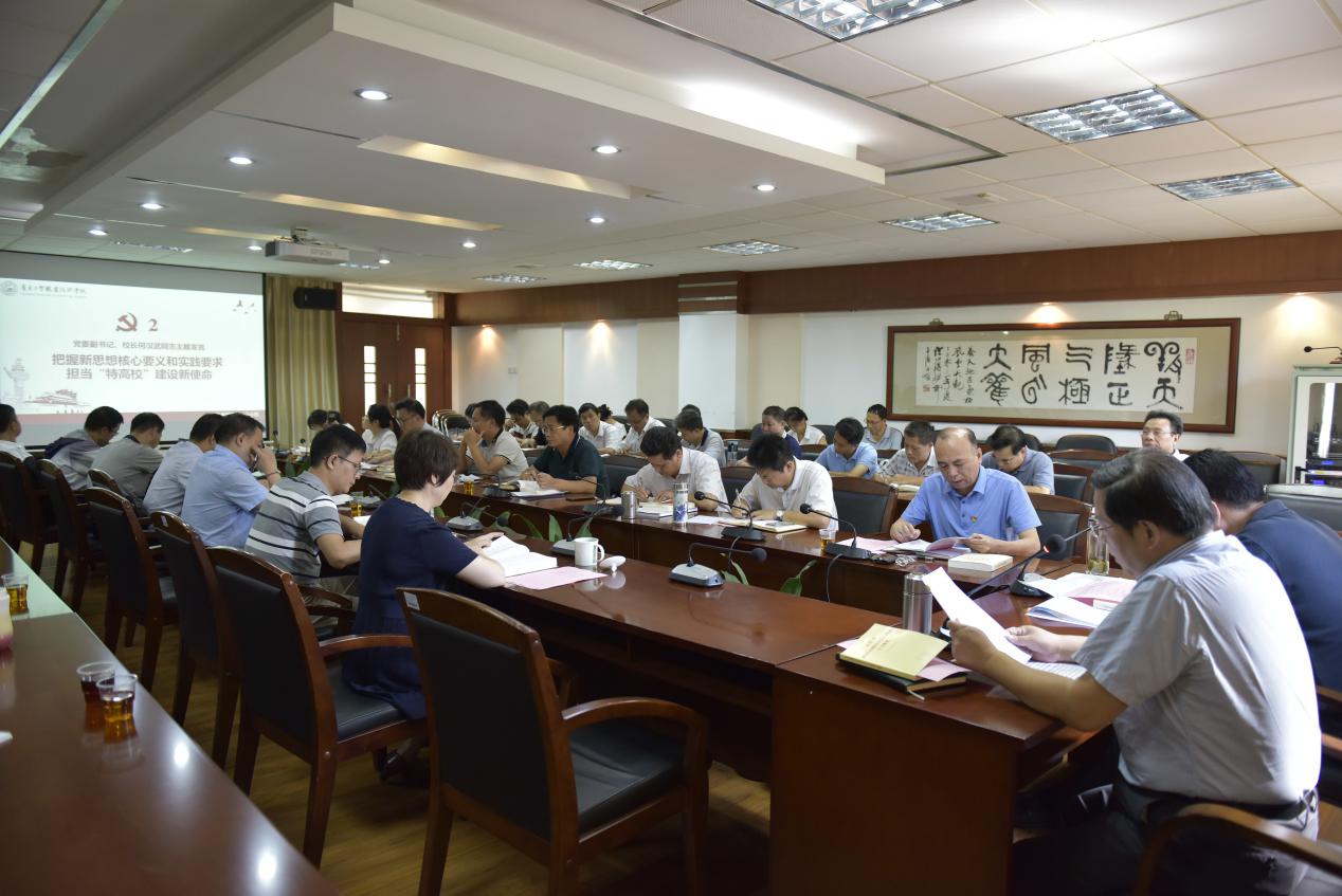 2019年9月24日,学校在天河校区召开党委理论学习中心组“不忘初心、牢记使命”主题教育学习研讨(扩大)会议。党委书记汤才同志主持会议,学习研讨的主题是“学习《中国共产党章程》、《习近平新时代中国特色社会主义思想学习纲要》,掌握新思想核心要义和实践要求”。学校领导何汉武同志、夏韩辉同志、陈珊兴同志和赵红同志及全体中层正职干部参加了会议。