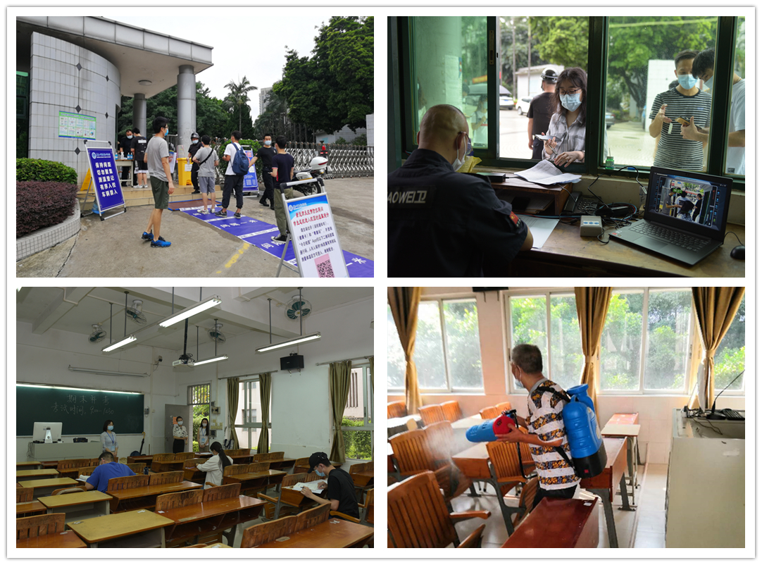 5月23日,天河校区迎来了回校参加考试的学生。为确保本次考试安全平稳有序,各职能部门和二级学院提前沟通协调、周密部署,按防疫要求、考务要求等规范周密组织学生返校考试。各考场均严格按要求提前清扫、消毒,并保持通风。开考前,监考人员对进入考场学生进行身份核验、测量体温并记录,引导学生按桌贴单人、单桌、单向落坐,并提醒学生全程佩戴口罩作答。开考后,学校领导带队进行了巡考。考场秩序井然,为后续批次毕业生返校参加毕业前补考工作积累了宝贵的经验。