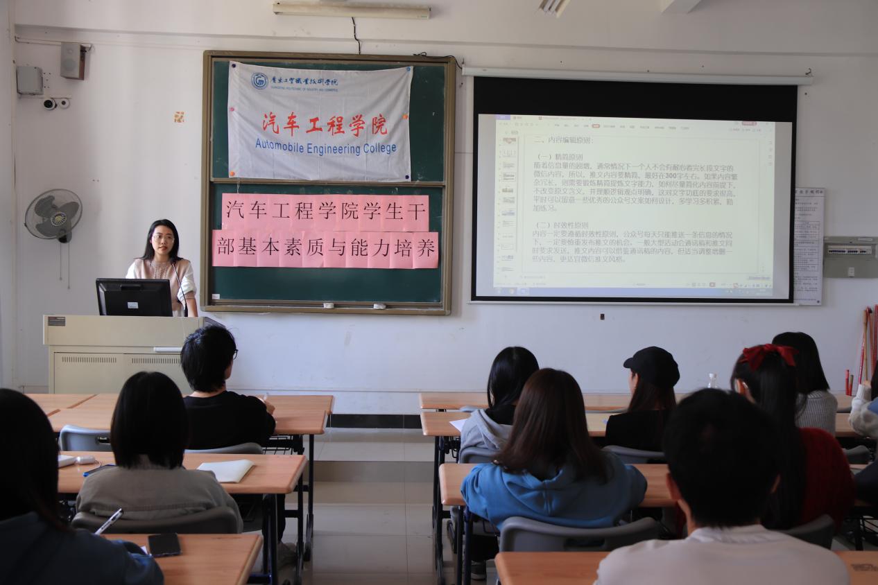 培训课现场图 本次培训班由汽车工程学院辅导员白雪担任主讲人,院团委学生会、青协、易班、院学生党支部全体干部及负责人参加了本次培训班。 培训伊始,白雪提出微信推文排版值得注意的三个问题,即微信推文怎么写、微信推文标题如何取、微信推文排版的具体要求。接着,根据微信推文怎么写这一问题,白雪强调两点:一是写作技巧,即内容逻辑要清晰,内容选材要注重实用性和趣味性。二是内容编辑原则,要注重精简原创与时效性原则。