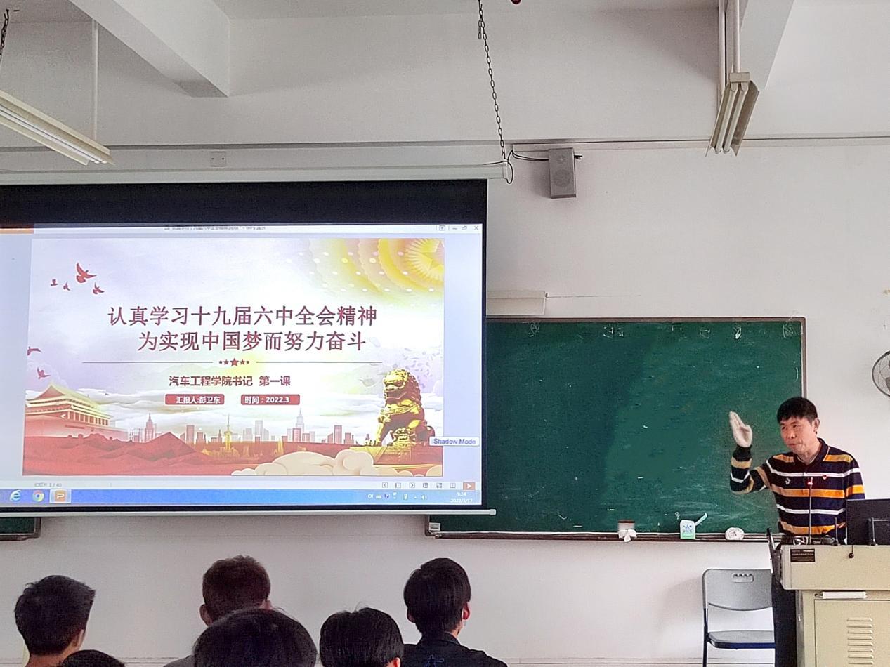 为进一步深刻领悟中国共产党百年来的奋斗历程和辉煌成就,学习贯彻党的十九届六中全会会议精神。2022年3月17日上午,汽车工程学院党总支书记彭卫东在明德楼2区304开展主题为《认真学习党的十九届六中全会精神,为实现中国梦而努力奋斗》思想政治理论第一课。由2021级部分学生参与了此次会议。