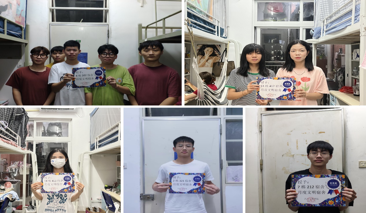 文明宿舍成员和奖状合影 5月12日,汽车工程学院文明宿舍上牌啦!以学院副书记带领的全体辅导员队伍,以及院团委学生会实践部成员组成的宿舍检查小组,肩负文明宿舍评选的重任,负责学生宿舍纪律、内务卫生监督和检查并打分。根据《学生手册》内宿舍内务管理规定,结合疫情常态化管理的各项要求,检查小组逐层、逐间进入宿舍检查,包括地面、墙面、床铺、门窗、阳台等内务卫生,以及严禁使用大功率电器、严禁宿舍内饲养动物等宿舍秩序及安全,对学院近400间宿舍做到一个不漏的“体检”。学生会干部检查过程中礼貌敲门、表明身份、填表打分、拍照记录,一气呵成,井然有序。检查宿舍内务的辅导员,除了指导检查小组开展工作外,还嘱咐文明宿舍继续保持,要求内务卫生不合格、有安全隐患等不达标宿舍完成整改,要求真正做到爱护宿舍环境、共创温馨小家。