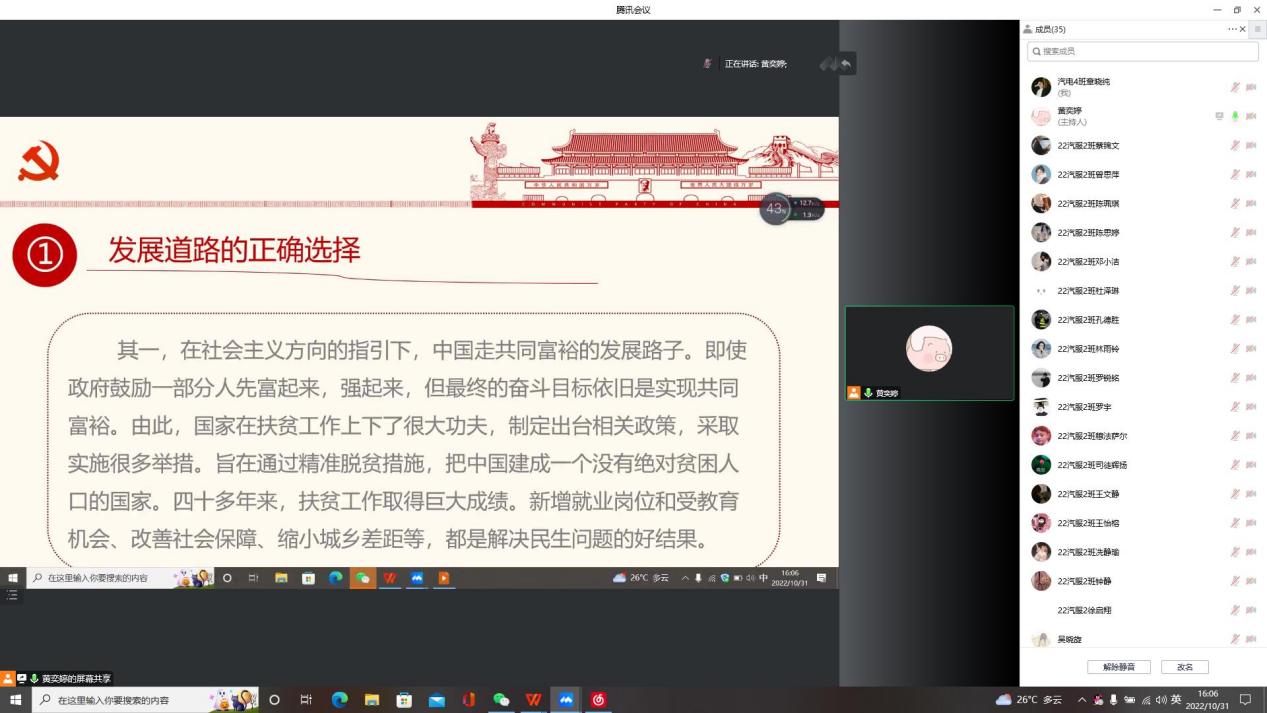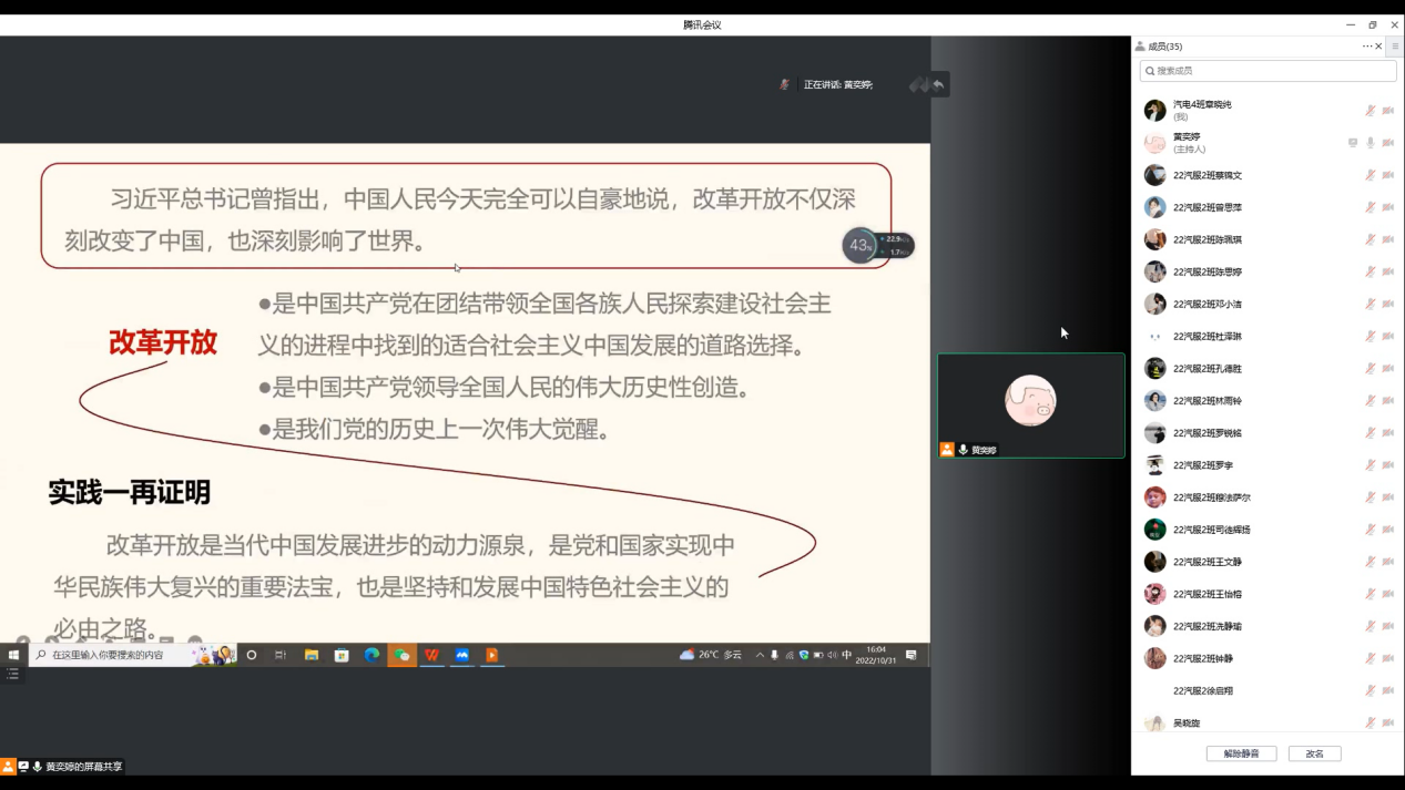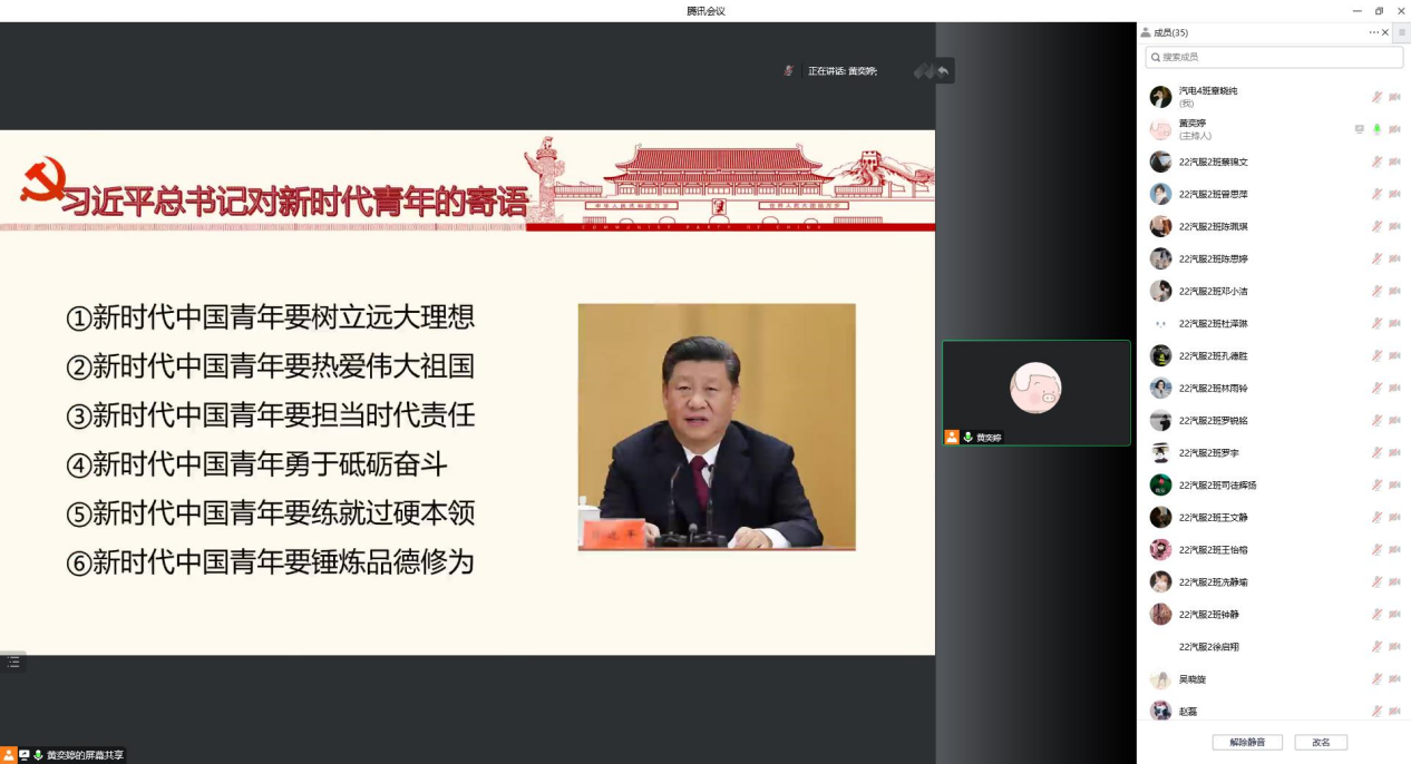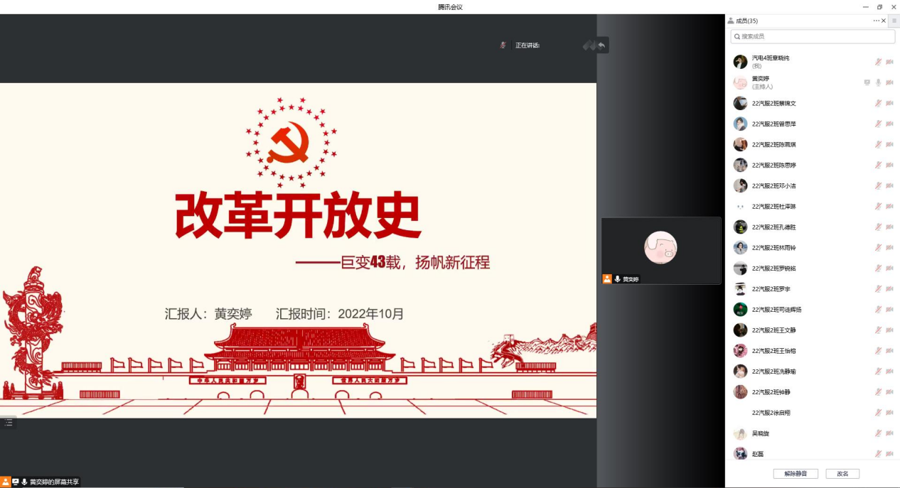 为认真贯彻习近平总书记重要讲话和中央政治局会议精神,不断提高党史学习教育的高度、深度、广度,引导广大学子坚定信念和使命,同时结合党史学习教育“五个一”活动,太阳集团城官网1407学生党史宣讲团成员黄奕婷于10月31日下午3点半在腾讯会议平台向汽车工程学院2022级汽车营销与服务专业2班的同学们宣讲改革开放史。