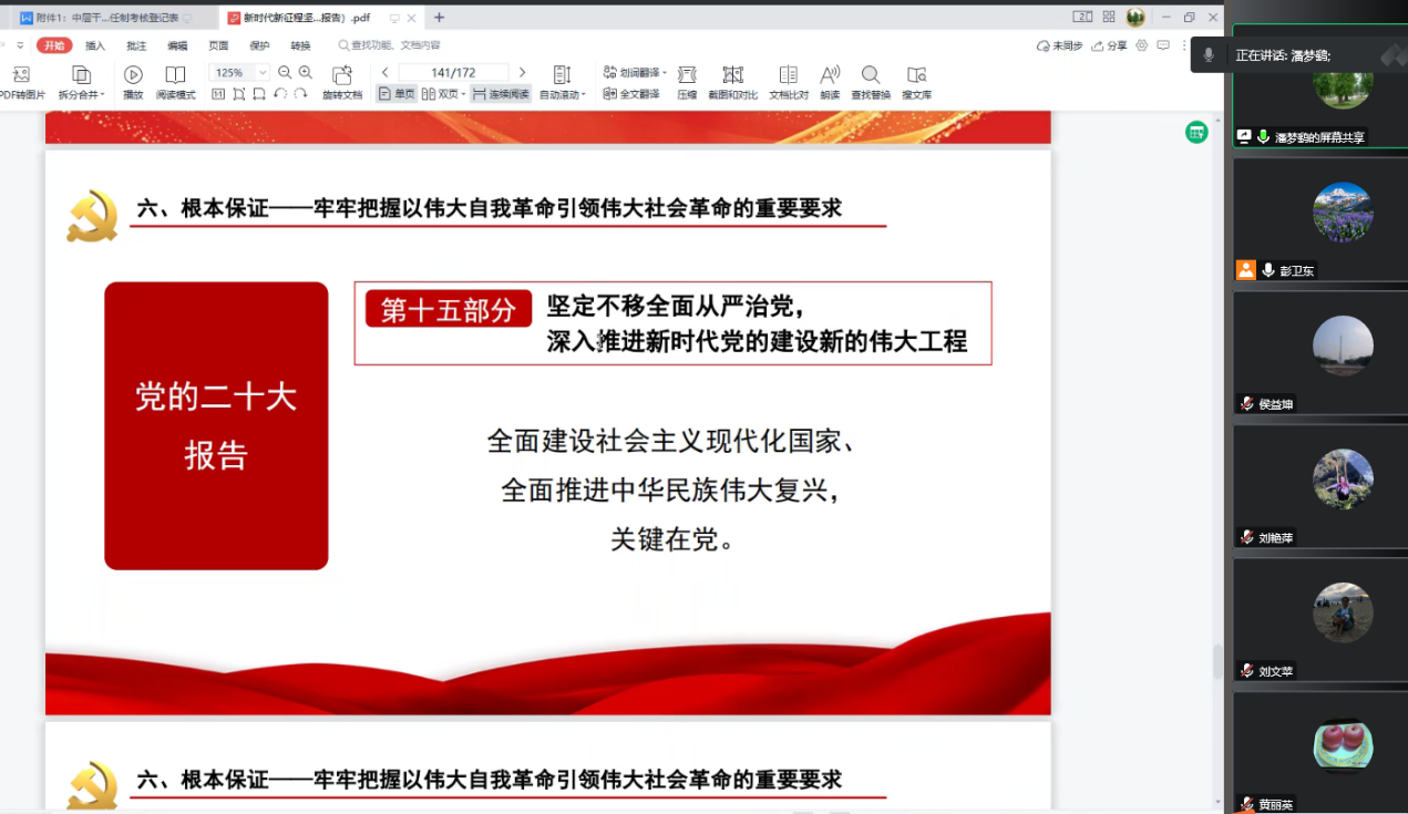 11月29日,汽车工程学院副院长潘梦鹞通过腾讯会议平台为汽车工程学院教师第一党支部全体党员讲党课,主题为“坚定不移全面从严治党,深入推进新时代党的建设新的伟大工程”。 潘梦鹞强调,党的二十大是在全党全国各族人民迈上全面建设社会主义现代化国家新征程、向第二个百年奋斗目标进军的关键时刻召开的一次十分重要的大会,是一次高举旗帜、凝聚力量、团结奋进的大会。党的二十大报告指出,腐败是危害党的生命力和战斗力的最大毒瘤,反腐败是最彻底的自我革命。新时代以来,党中央秉持坚韧顽强的斗争精神,坚持无禁区、全覆盖、零容忍,坚持重遏制、强高压、长震慑,坚持受贿行贿一起查,坚持有案必查、有腐必惩,“打虎”、“拍蝇”、“猎狐”多管齐下,开展了史无前例的反腐败斗争,推动全面从严治党不断取得新成效。 汽车工程学院教师第一党支部全体党员纷纷表示,本次党课收益甚多,在接下来的日子将认真学习党的二十大精神,深刻把握党的二十大做出的战略部署,坚决维护党中央权威和集中统一领导,坚持以严的基调强化正风肃纪,锲而不舍落实中央八项规定精神,坚决打赢反腐败斗争攻坚战持久战。在政治立场、政治方向、政治原则、政治道路上同党中央保持高度一致,确保党的二十大战略部署落实见效。 党课现场 (汽车工程学院 文/图 沈洁云 编辑/陈锐钊 审核/彭卫东) |