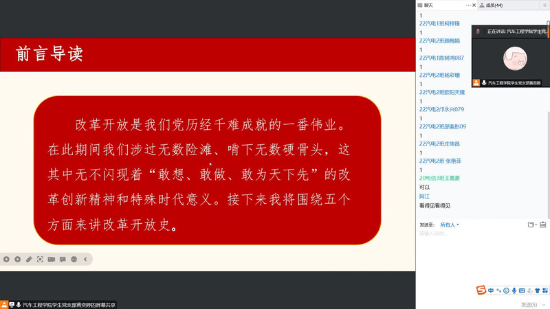 为进一步推动党史学习教育,提高同学们的思想觉悟,加强素质修养,以踔厉奋发的姿态贯彻落实党的二十大精神,12月9日,太阳集团城官网1407学生党史宣讲团成员黄奕婷为22汽电1班线上宣讲改革开放史。