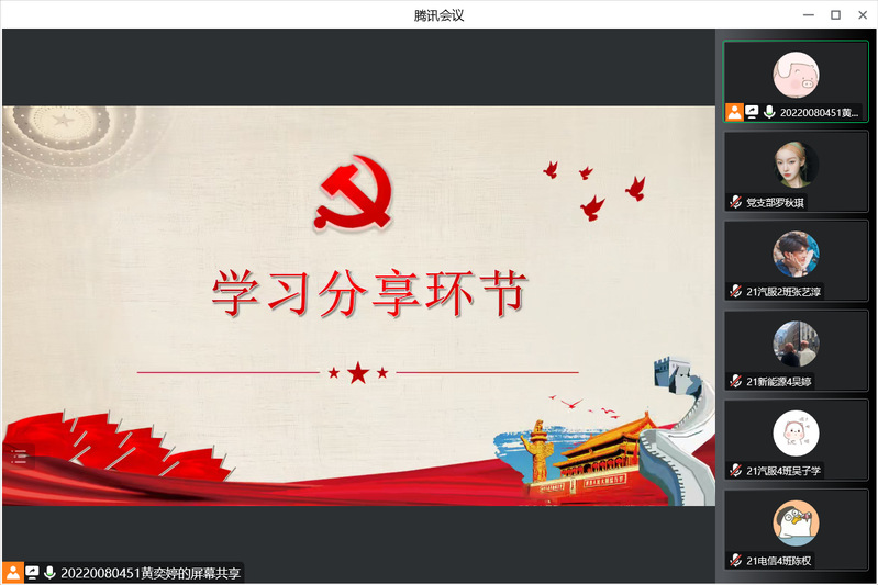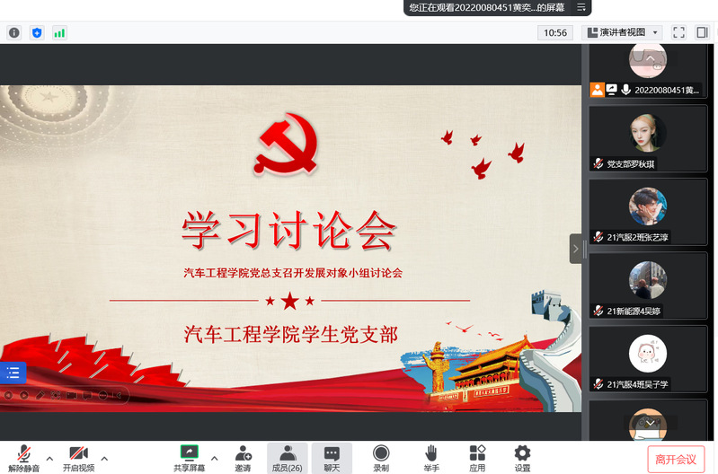 为了做好党员发展工作,进一步提高发展对象的党性修养,坚定入党信念,端正入党动机,正确了解党风党纪的重要性。12月15日下午,汽车工程学院学生党支部召开2022年下半年发展对象线上学习讨论会。此次会议由支部党员黄奕婷主持。出席本次会议的有支部书记刘彩云、支部其他党员以及发展对象。