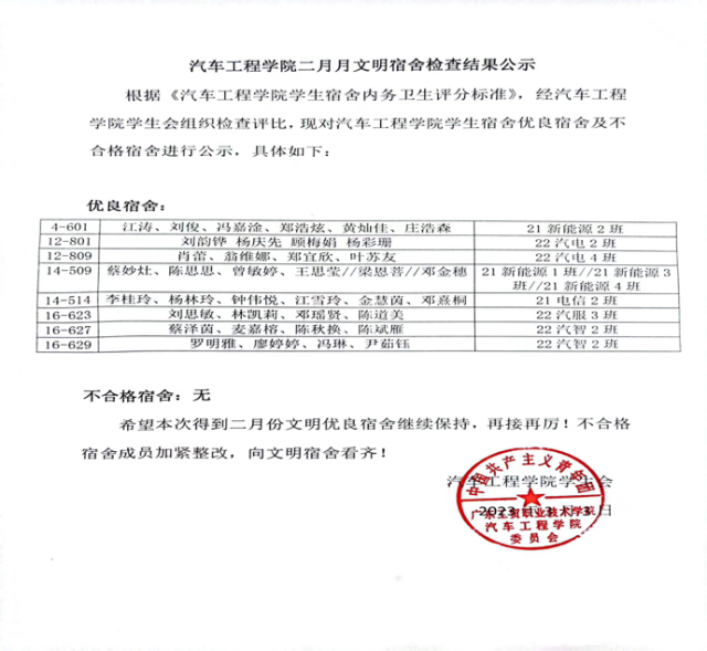 二月月文明宿舍检查结果公示 通过检查评比,对表现优秀的宿舍进行表彰,同时也号召广大同学向他们学习,共同营造良好的宿舍环境氛围,宿舍虽小,但感情在这里凝聚,梦想在这里交汇,一种独特的宿舍文化已成为一种文明,成为我们生活必不可少的一部分。