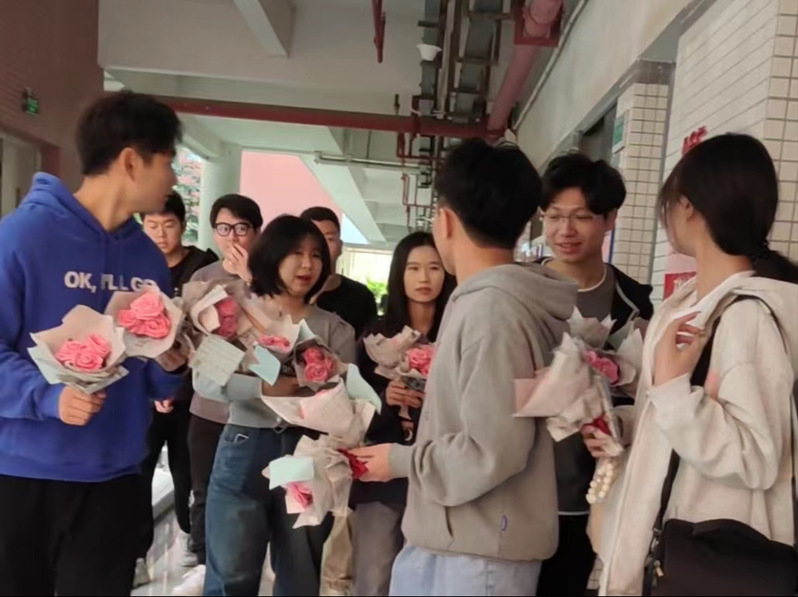 给老师们送花过程 一束花,一份祝福,不仅缓解了繁忙的工作压力,更营造了和谐温暖的学院氛围,使每一位女老师充分感受到了节日带给她们的喜悦和快乐。利用这样特殊的节日为老师送去祝福,表达学生们对老师的感恩情怀。 (图/汽车工程学院学生党支部 文/温雅麟 编辑/刘彩云、林诺怡 审核/彭卫东) |