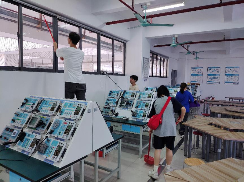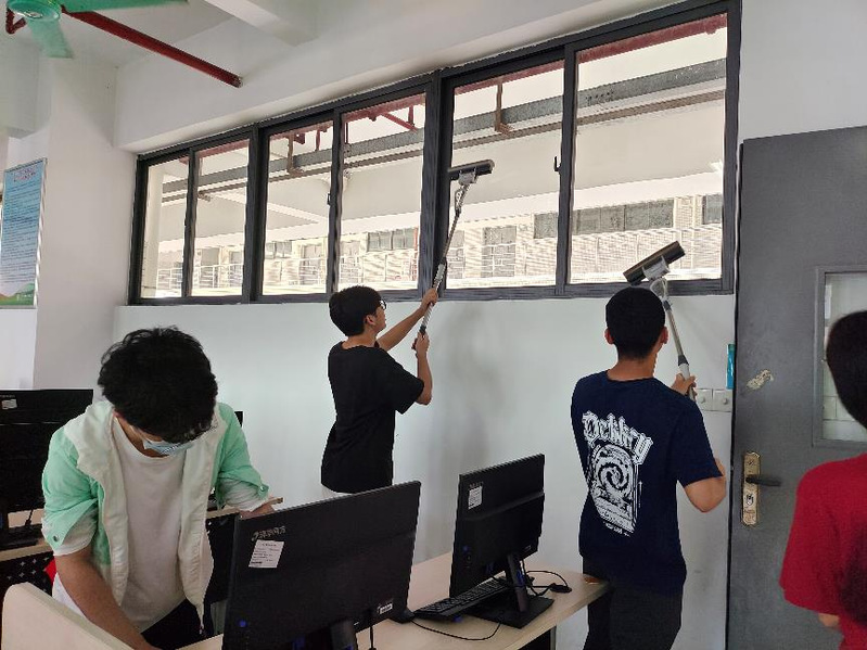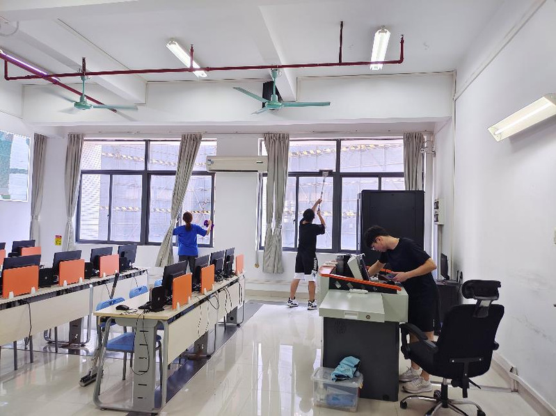 实践活动中 他们自带清洁工具有条不紊地进行分组、分工合作,在各个区域认真打扫清洁教室的各个角落。现场气氛活跃,干劲十足的他们发挥了不怕苦、不怕累、任劳任怨的精神。在全体发展对象的共同努力下,教室以及教学器材干净整洁、焕然一新。