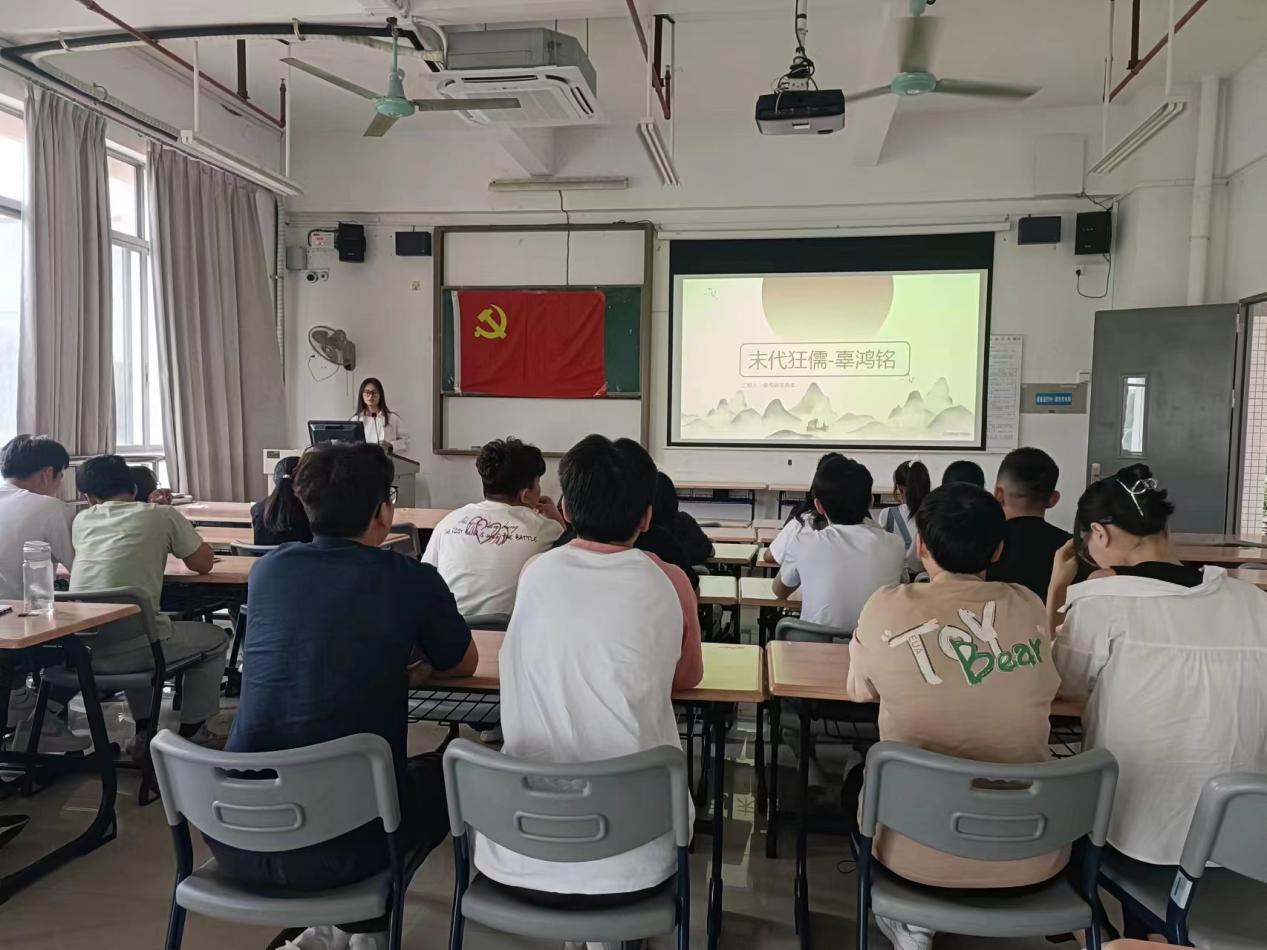 李贤柔介绍辜鸿铭先生 随后,李贤柔同志向大家介绍了清朝时代精通西洋科学、语言兼东方华学的“中国第一人”辜鸿铭。她从辜鸿铭先生的事迹、人物评价以及人物精神依次进行讲解,并倡导大家要学习老先生的民族自信与爱国精神。