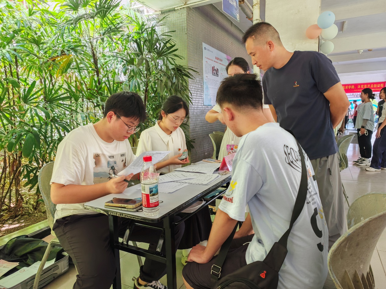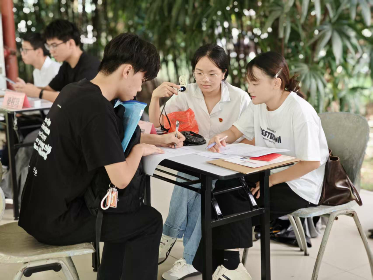 班主任和助理班主任为新生办理报到手续 新生们在学长学姐的热情指引下,陆续步入学院报到处并开启入学流程。报到处精心设置了人脸采集处、班级报到点、专业答疑台等服务站点,全方位助力新生顺利入学。各班班主任、助理班主任以及在场所有工作人员都耐心为新生们答疑解惑,细致地收集相关材料,协助新生完成报到登记和信息录入,迅速拉近了新生与学院的距离。此外,为让家庭经济困难新生无忧入学,报到处专门开通“学院绿色通道咨询点”,提供生源地贷款办理的“一站式”服务,传递着学院对学子们的关爱。在此期间,校领导们也亲临现场,了解新生报到情况,对迎新工作给予悉心指导与宝贵建议。