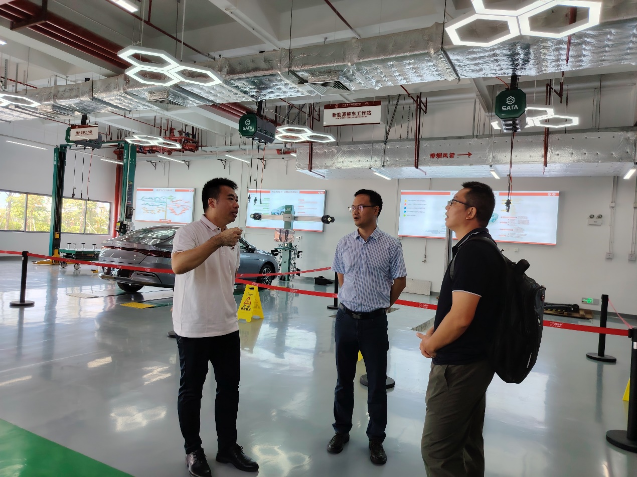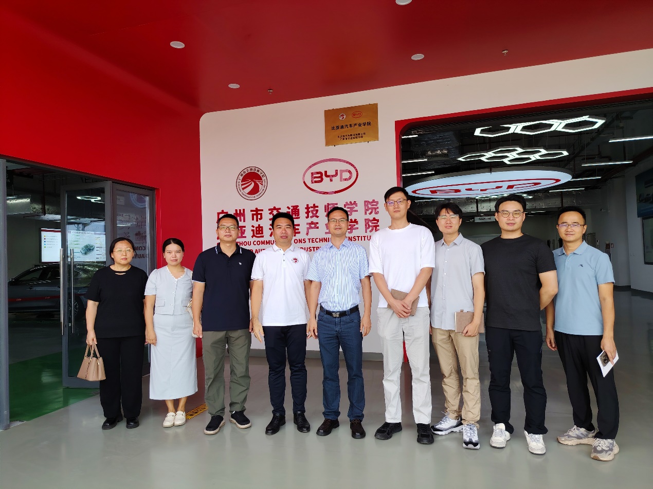 图1 参观比亚迪产业学院 汽车与能源产业系的新能源汽车检测与维修专业,为人社部工学一体化建设专业、工信部首批产教融合试点专业及广州市重点建设专业,专业技术实力雄厚。在陈守青主任陪同下,调研团队实地参观了比亚迪产业学院、特斯拉产业学院、广汽产业学院,详细考察了动力电池装配与测试、高压维修、新能源整车维护保养等系列实训基地,深入学习新能源实训基地建设经验。
