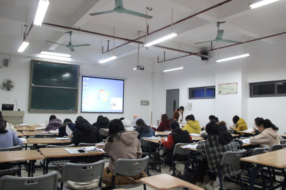 在考场中,学生们有的低头沉思,有的奋笔疾书,教室里充满着和谐紧张、有条不紊的比赛氛围,以及笔和纸摩擦着的沙沙的声音。