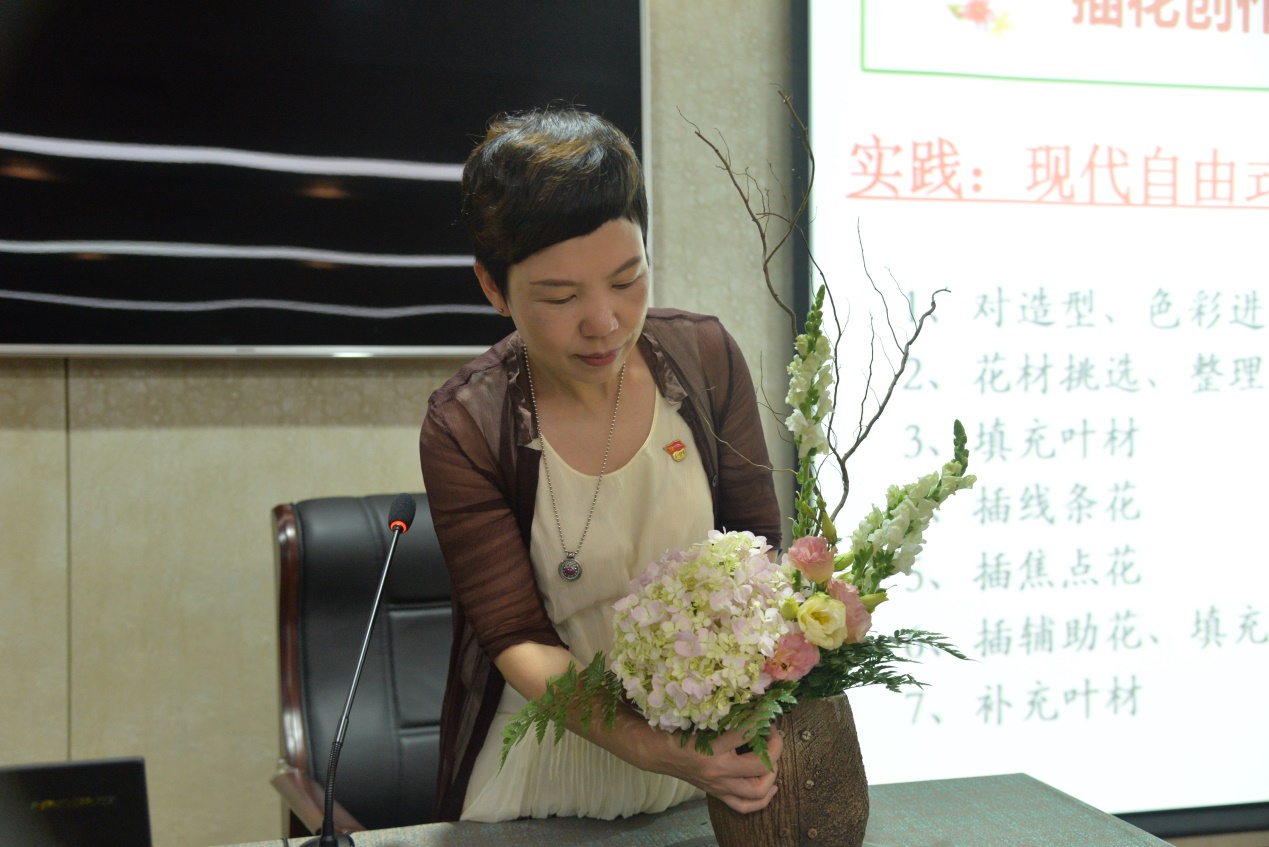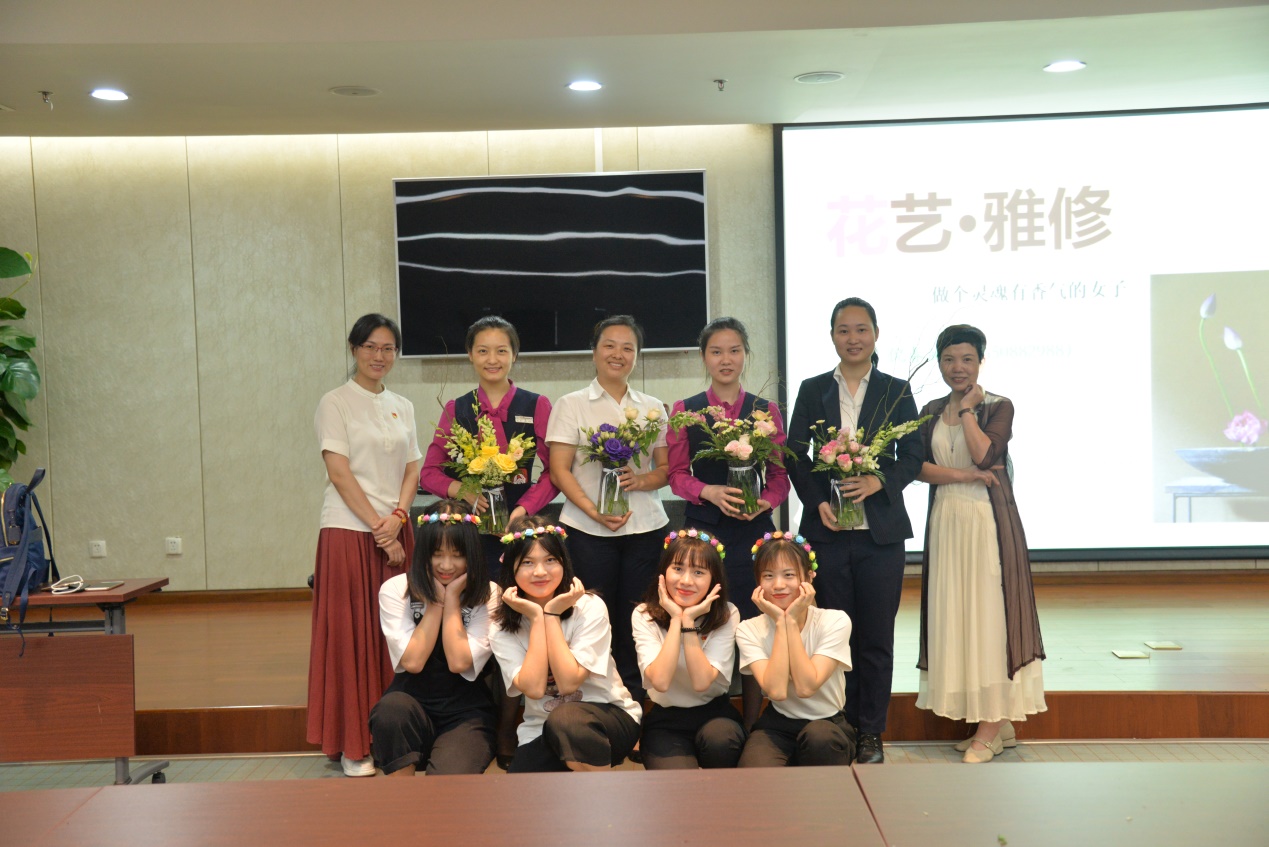 插花,不仅可以美化居住环境,为家庭生活增添美感和温馨,也是探新访友、迎送宾客最高雅、最珍贵的礼品。学会插花,可以与花作伴,以花为友,滋养心灵,陶冶情操,表达情感。2019年5月30日,工商管理学院倪春丽副院长带领李爽老师以及四位学生助教组成社会服务团队,为广东美居物业管理公司提供花艺雅修社会服务。