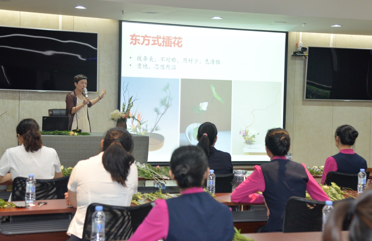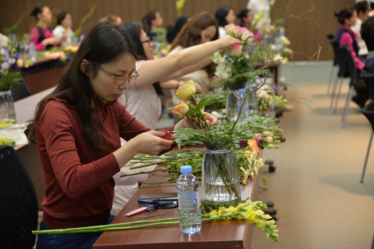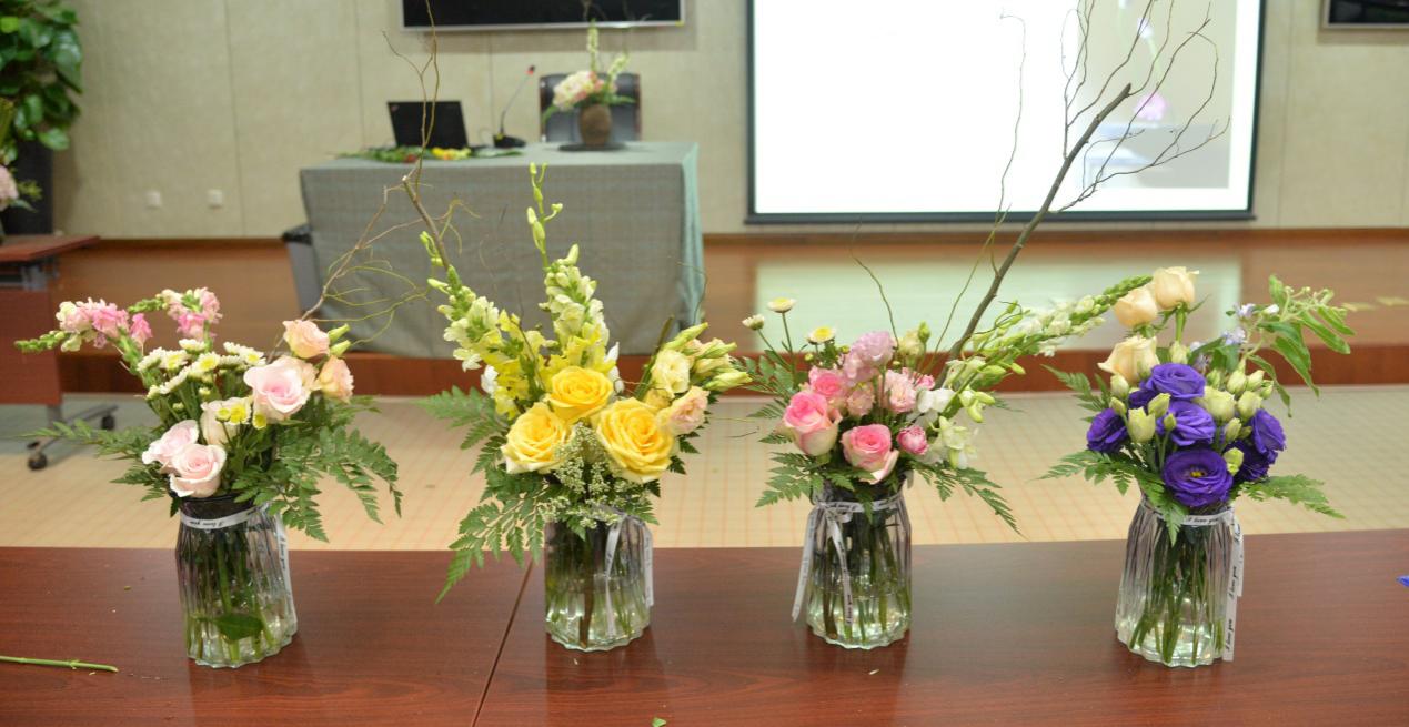 培训前,助教们给每一位学员提供了鲜花和花瓶,让选手提前感受鲜花的质感。之后,倪老师通过插花示范,加深了参与者对插花技能与步骤的了解,也让在场人员更深刻体会到插花艺术的美丽之处。