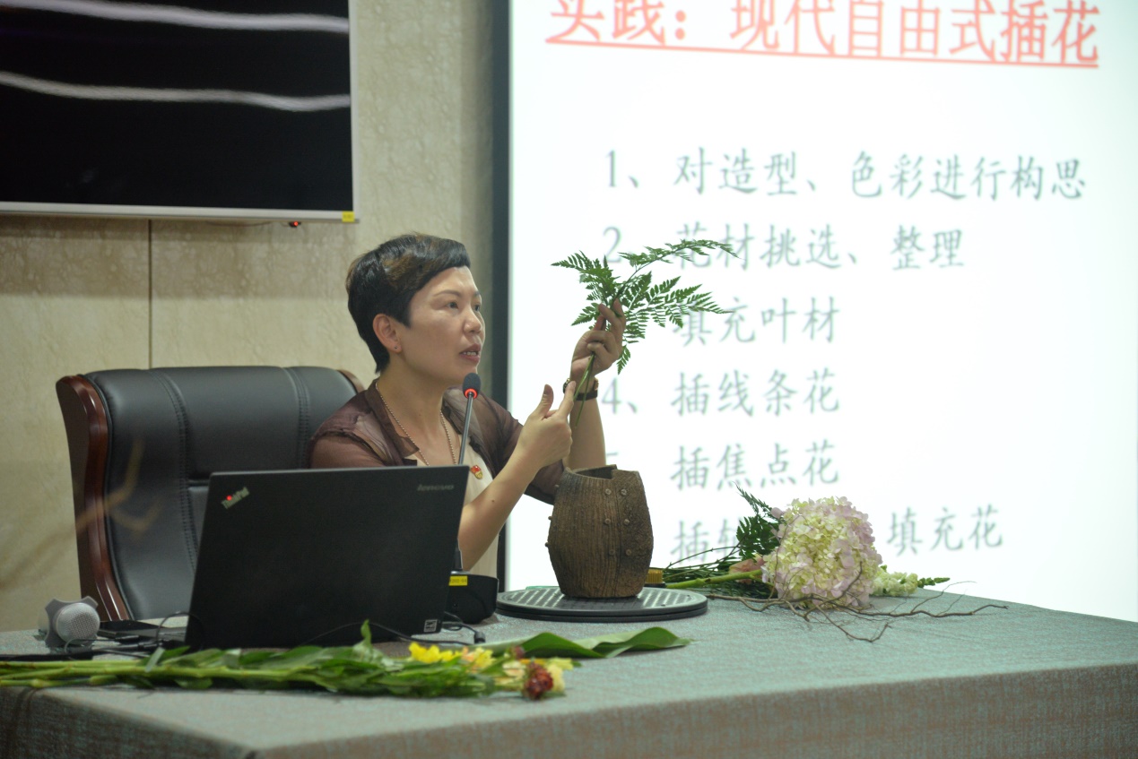 倪老师首先引导学员们理解花道,花艺通过融入心情,形成一种修养,逐渐变为一-种文化, 即是花道。之后,倪老师讲解了东方式、西方式、现代自由式等三种插花艺术风格,三种风格各有风采。东方式插花追求意境美;西方式插花追寻几何对称美;现在自由式插花则无拘无束,追求造型美。接着,倪老师从花材的选购、花材形态等方面讲述了插花艺术的基础知识,内容丰富有趣,大大激发了学员们的学习热情。