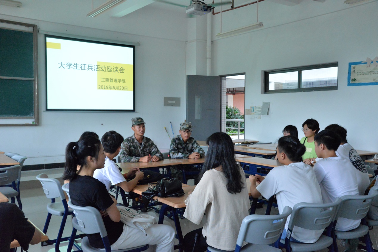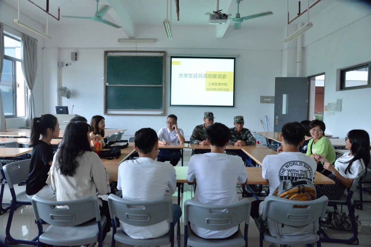 2019620日,工商管理学院在白云校区明德楼1-412举行大学生征兵工作座谈会。此次座谈会举办旨在宣传我国征兵活动,鼓励大学生进入军队,体验军旅生活,为我国国防力量贡献力量。工商管理学院党总支谢宏祥副书记、辅导员罗福周、退伍士兵以及各班级13名学生代表参加座谈会。