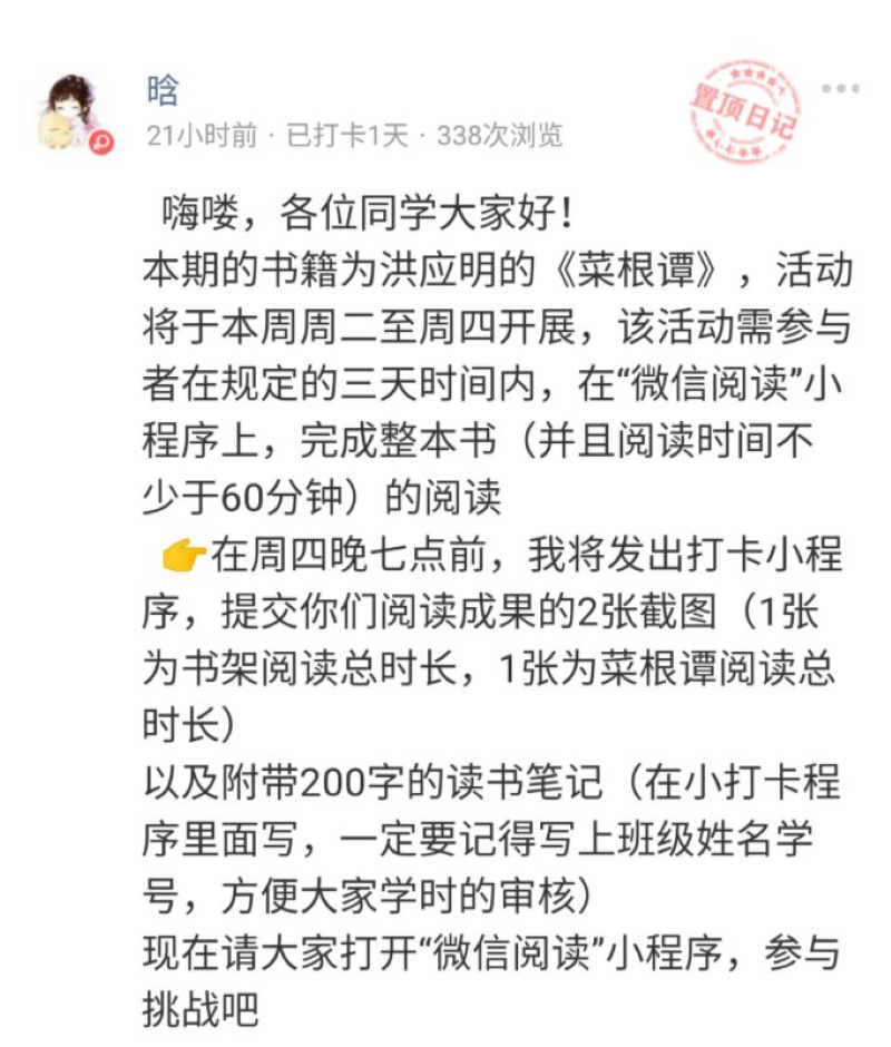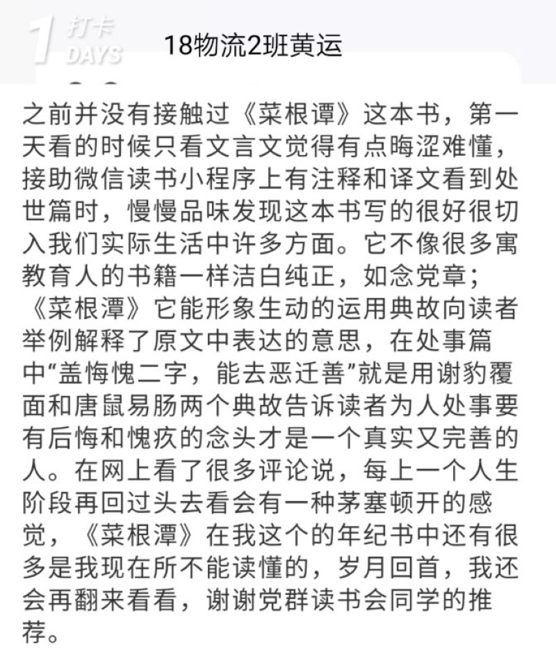 为弘扬和传承中华优秀文化,鼓励同学们在疫情期间不忘学习,陶冶生活情操,悟人生哲理,工商管理学院党群服务中心于2020年3月31日至4月2日采取“线上微信阅读”打卡形式,组织开展第40期中华读书会,品读明代学者洪应明的作品《菜根谭》。本次活动共有120名同学参与。