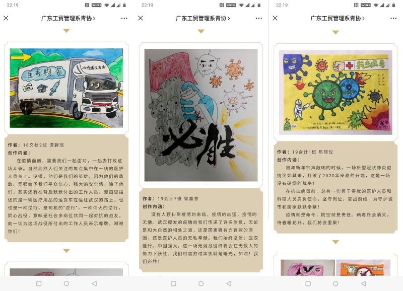 在这场全民战疫中,无数平凡又温暖人心的小事,都散发出不平凡的美好光芒。即使我们不能到疫情一线贡献自己的力量,但却可以用自己的方式表达对战役的决心。因此,我院在2020年3月12日-3月25日期间举办“同心战疫”文化创作活动,共收到4份视频材料作品、9份绘画漫画手抄报类作品、21份征文类作品和推文作品11篇。希望以此次活动彰显社会正能量,号召同学们同心战疫,坚定信念,温暖前行。