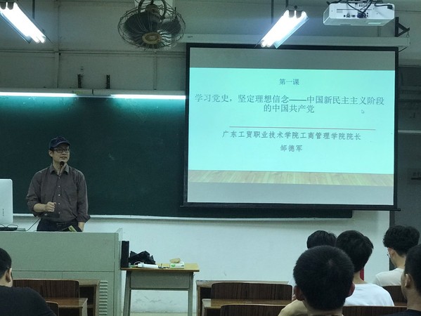 为庆祝中国共产党诞辰100周年,弘扬红色精神,进一步加强爱国主义教育,工商管理学院天河校区于4月26日晚7点在西区综合楼406举办主题为“学习党史,坚定理想信念——中国新民主主义革命阶段的中国共产党”的院长思政第一课,工商管理学院院长邹德军担任主讲,工商管理学院天河校区约80名同学参加了本次学习。