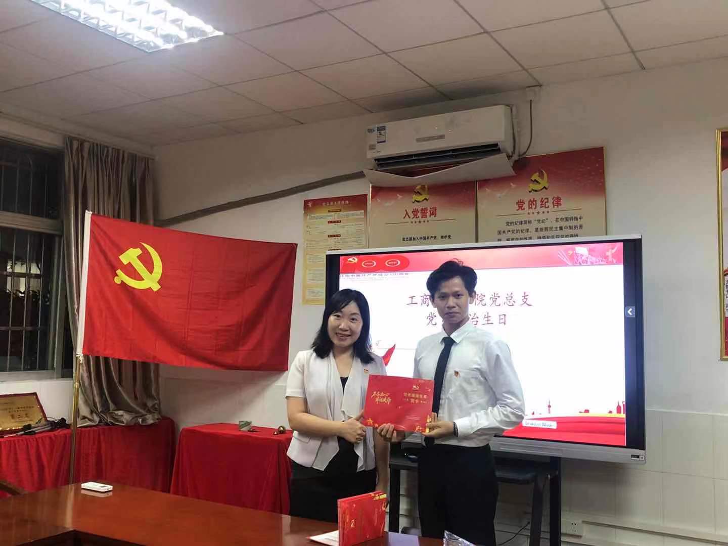 工商管理学院学生第一党支部书记谢简为党员颁发贺卡