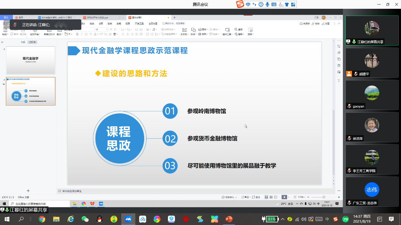 江暮红分享了《现代金融学》的课程思政建设经验,江教授从“民族情怀”、“爱党爱国”、“政治认同”、“改革艰辛”、“国富民强”等阶段,结合学生参观货币博物馆和岭南博物馆的感悟,有效将历史展品融入教学,让学生设身处地感知广东省金融业发展历程。