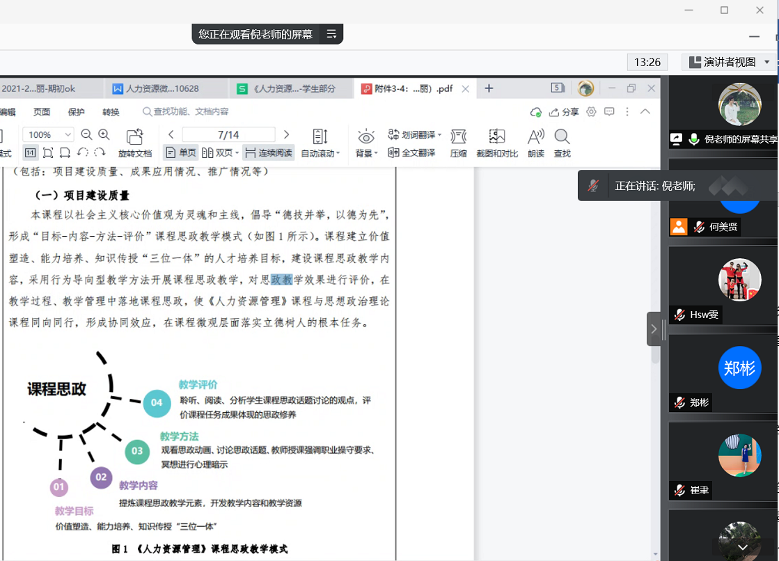 为贯彻落实立德树人根本任务,筑牢意识形态阵地,传承红色基因,推动教育教学改革发展,8月20日下午,工商管理学院商业服务系召开了以“立德树人、铸魂育人”为主题的党史教育融入课程思政线上研讨会,会议由商业服务系主任何美贤主持,工商管理学院党总支书记周清莲、副院长倪春丽以及商业服务系全体教师参加了此次研讨会。
