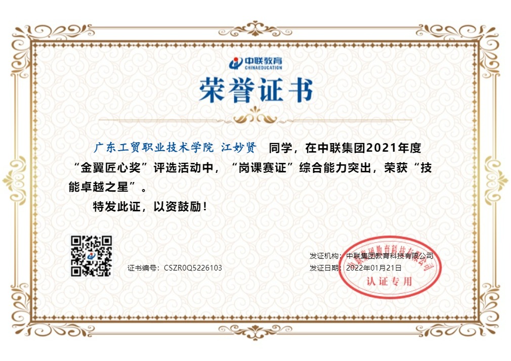 随后,中联集团教育科技有限公司林明经理代表中联集团向大家表示祝贺并为学校颁发了“2021年度中联集团“金翼匠心奖”校企合作优秀奖,为我校张露老师分发了“金翼匠心奖”荣誉证书。此外,中联集团聘袁年英为“中联集团教育科技有限公司‘岗课赛证’专家委员会专家委员(数字商贸方向)”并颁发了聘书。