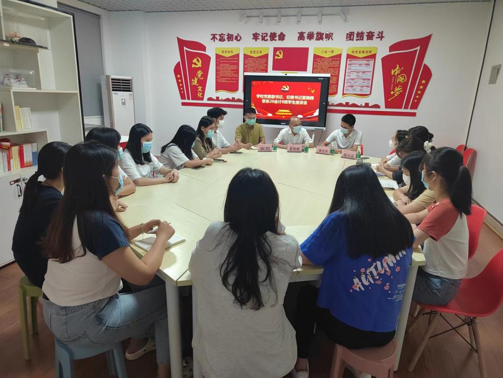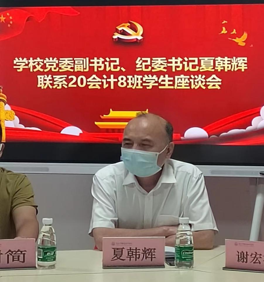 为庆祝中国共产党第二十次全国代表大会胜利召开,引导广大团员青年全面认识党的光辉历程和伟大成就,团结引领广大青少年坚定跟党走、建功新时代,推动学校落实立德树人根本任务,强化“三全育人”新格局,筑牢疫情防控常态化下的安全稳定之基,10月22日晚,学校党委副书记、纪委书记夏韩辉来到联系的20会计8班,开展了以“展现时代担当 守护防疫屏障 以青春力量献礼党的二十大”为主题的座谈会,与同学们一起谈担当、话成长。工商管理学院党总支副书记谢宏祥,辅导员谢简、杨兴花,以及14位学生代表参加了座谈会。