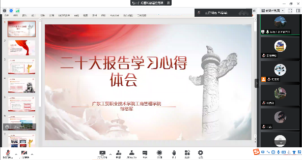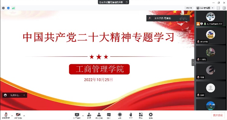 为认真学习宣传贯彻落实党的二十大精神,根据学校党委《关于开展党的二十大精神专题学习的通知》安排及疫情防控的有关要求,10月25日下午,工商管理学院以线上会议形式组织开展学院全体教职工党的二十大精神学习研讨会议。会议由学院党总支书记周清莲主持,学院班子成员及全体教职工参会。