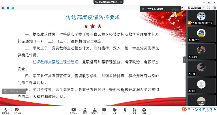 专题学习研讨结束后,会议还传达学习了学校近期关于疫情防控的有关通知。周清莲对疫情防控工作作了部署,要求学院班子、党员教师应主动承担作为,强调学工队伍需密切联系学生,专任教师要认真组织好线上教学,开展好课程思政。学院班子成员对自己分管工作领域作了具体要求和提醒。