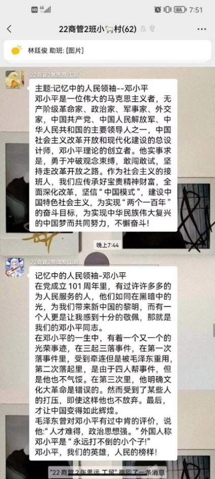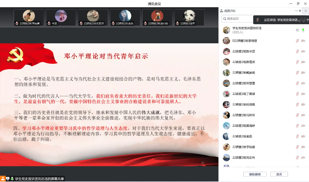 为让青年学生筑牢理想信念,厚植爱国情怀,深入了解中国共产党的奋斗历史,10月25日,校学生党史宣讲团成员、工商管理学院学生第三党支部预备党员刘志浩向工商管理学院2022级商务管理专业2班以“记忆中的人民领袖——邓小平为题”开展了一次线上党史宣讲。