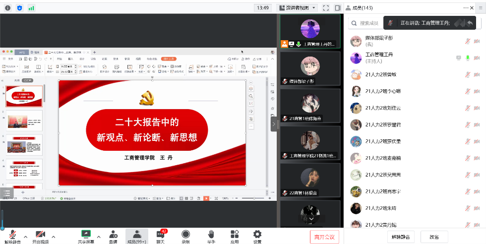 为深入学习宣传贯彻党的二十大精神,12月28日下午,工商管理学院通过腾讯会议开展以“党的二十大报告中的新观点、新论断、新思想”为主题的宣讲会,由党的二十大精神学校宣讲员、工商管理学院辅导员王丹老师进行主讲,商业服务系全体学生干部、入党积极分子和党员发展对象参加。