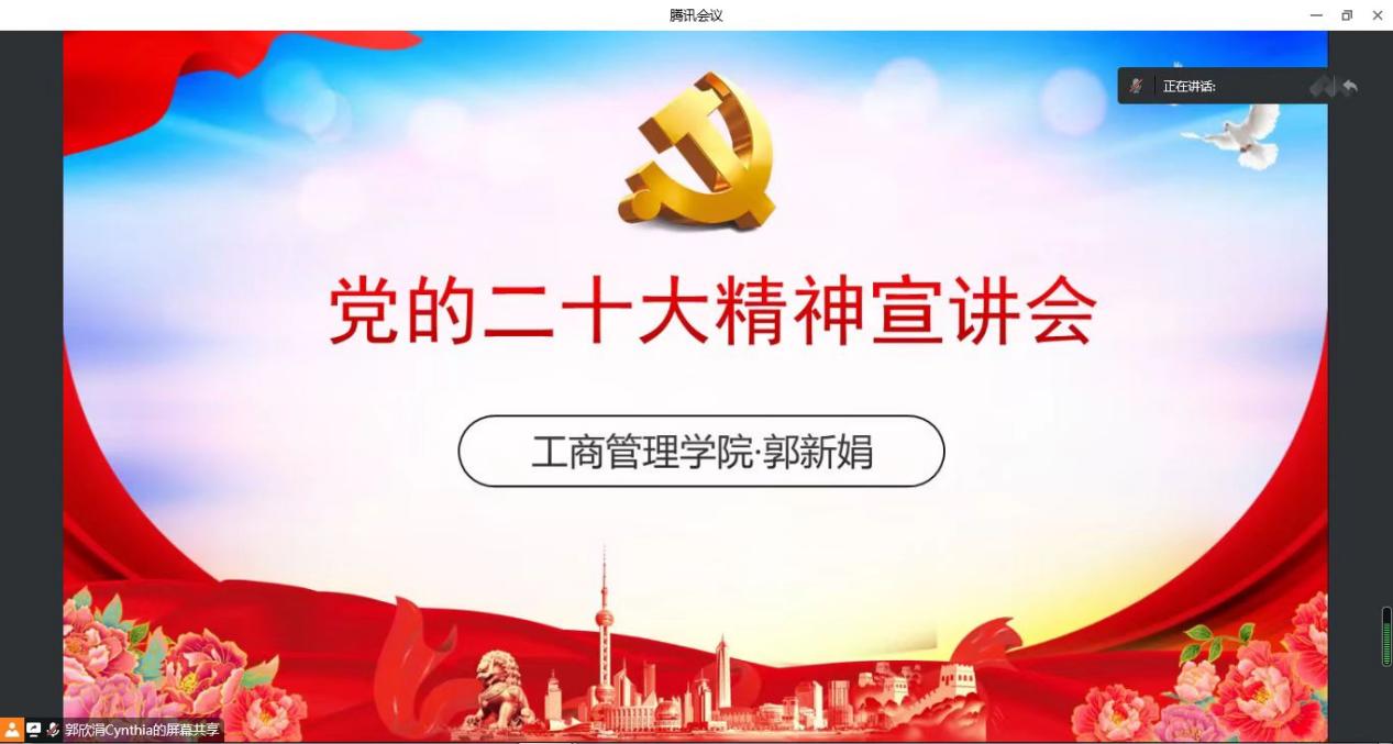 为深入学习宣传贯彻党的二十大精神,教育引导广大学生感党恩、听党话、跟党走,12月20日晚,党的二十大精神学校宣讲员、工商管理学院辅导员郭新娟通过腾讯会议开展党的二十大精神线上宣讲会,财税服务系全体学生参加了学习。