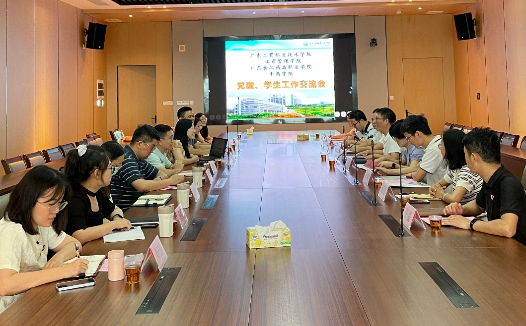 为学习贯彻习近平新时代中国特色社会主义思想,进一步发挥我校工商管理学院党总支“广东省党建工作标杆院系”的示范、引领和辐射作用,加强校际间工作经验交流与合作,实现“资源共享,优势互补,共同提高”, 6月16日上午,广东食品药品职业学院中药学院党总支书记利健文带领辅导员一行9人来到太阳集团城官网1407工商管理学院开展了党建及学生工作交流会。交流会在工贸白云校区图书信息楼第二会议室会议举行,由工商管理学院党总支书记周清莲主持,工商管理学院党总支副书记谢宏祥以及学院全体辅导员参加活动。