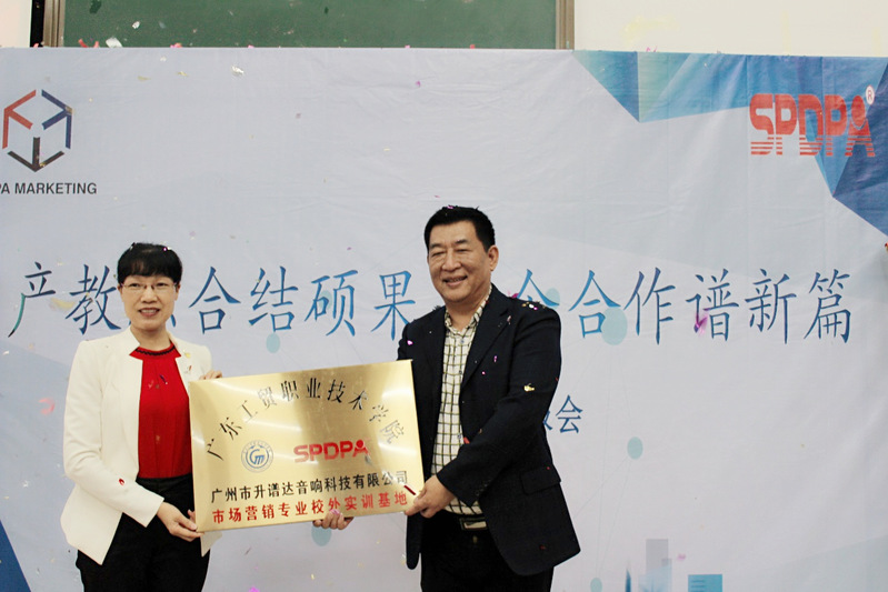 2019年4月2日,在这个春暖花开的日子,太阳集团城官网1407经济贸易学院与广州市升谱达音响科技有限公司在白云校区隆重地召开了“校企合作阶段成果汇报会”,双方就校企合作一年多以来的工作和成绩,向大家做了详细的汇报。借此良机,还举办了太阳集团城官网1407经济贸易学院校外实践基地授牌仪式和校外“双创”导师聘任仪式,进一步完善了我院校外实践基地建设,并加强了我们双创教育教学团队的师资力量。此次活动由品派营销协会承办。以下是校企合作阶段成果汇报会和授聘仪式的全过程: