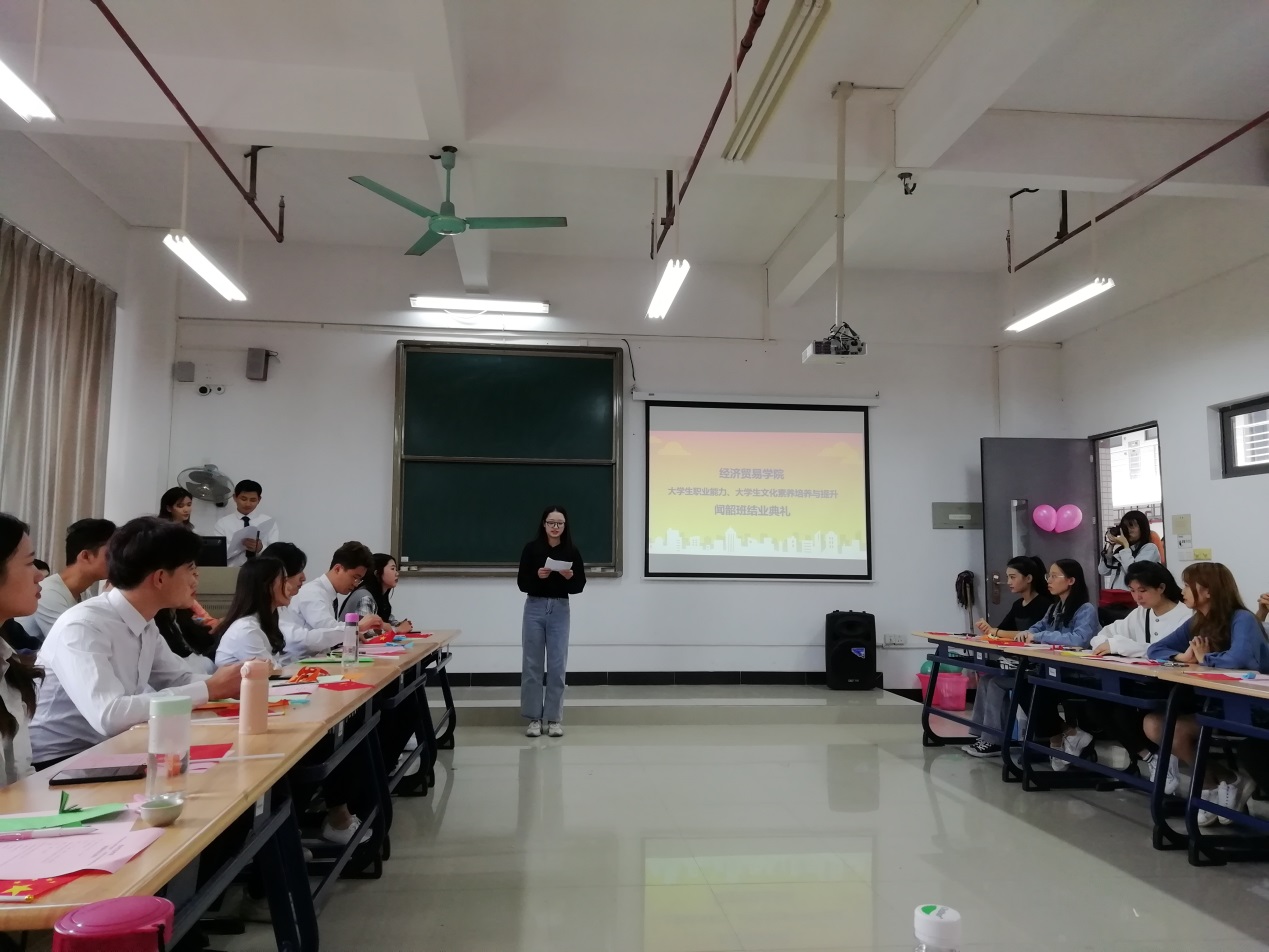 2019年10月31日下午,经贸学院“闻韶班”结业典礼仪式在明德楼1-514正式拉开了序幕,出席活动的有经贸学院院长邱秀芳、党总支副书记龚云、办公室主任邓彩云以及骨干教师李艇、刘佳珺,出席典礼的还有广州雇者品牌咨询有限公司高级培训主管冯玥怡女士以及闻韶班52名同学。