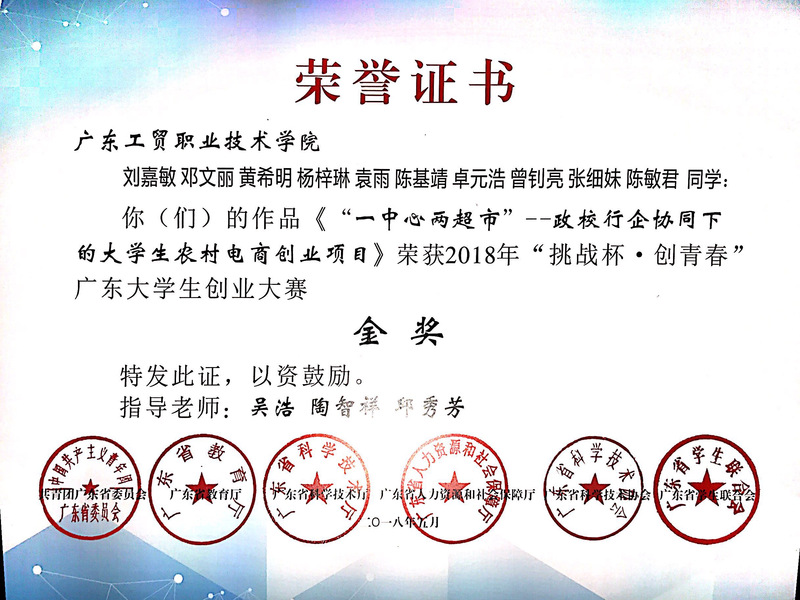 《“一中心两超市”--政校行企协同下的大学生电商创业项目》荣获2018年“挑战杯·创青春”广东大学生创业大赛金奖