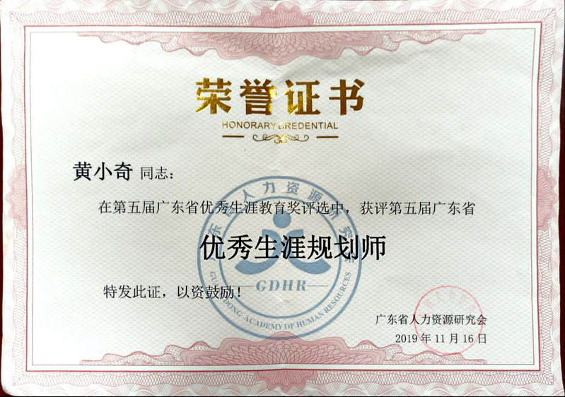 一直以来,黄小奇老师致力于学生的生涯规划教育一线教学等实践工作,并通过创新创业、校外职业生涯训练基地等载体丰实高职院校学生的职业生涯教育,其实践活动是诸多高职院校一线生涯规划教育工作者的缩影。第五届广东省优秀生涯教育奖致力构筑寻求发现、总结提高和交流分享的平台,建立人力资源管理的服务行业标杆和标准,进而推动广东省企业发展,促进社会经济转型以及实现国家人才发展战略。本次共表彰“优秀生涯规划师”共11人,“优秀生涯机构奖”5个,他们来自教育行业、文化产业、科技产业、公益机构等。