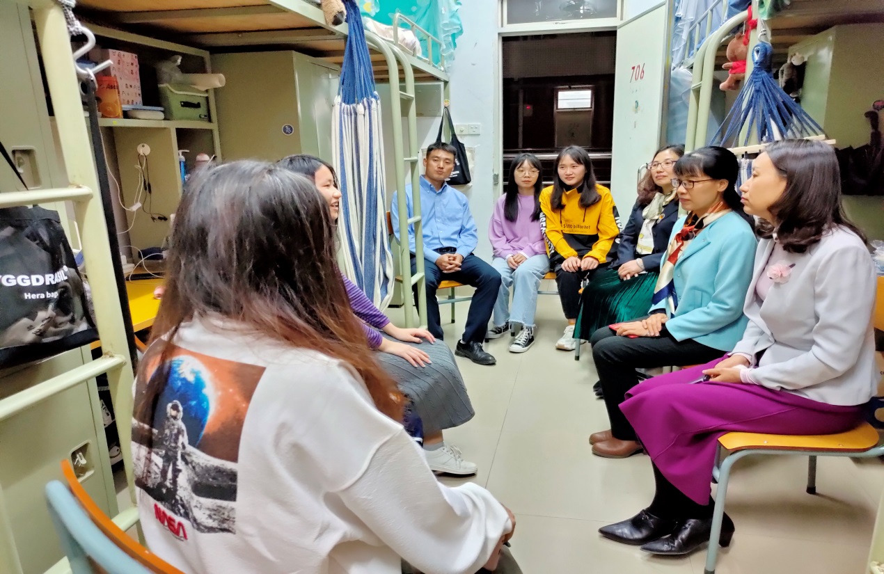 进一步加强优良校风学风建设,促进校园和谐稳定,按照《学校领导干部深入基层联系学生工作的实施方案》文件精神,落实二级学院领导班子深入学生宿舍工作机制,12月30日晚,经贸学院党总支副书记、院长邱秀芳,党总支副书记龚云,副院长方洁深入营销、国贸、电商三个学生宿舍调研检查了解学生宿舍卫生、消防安全等情况。学院办公室主任邓彩云参加了检查。