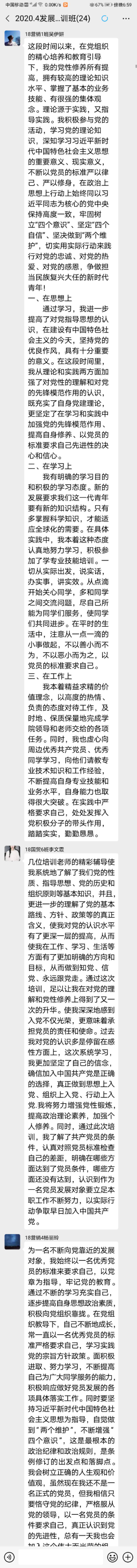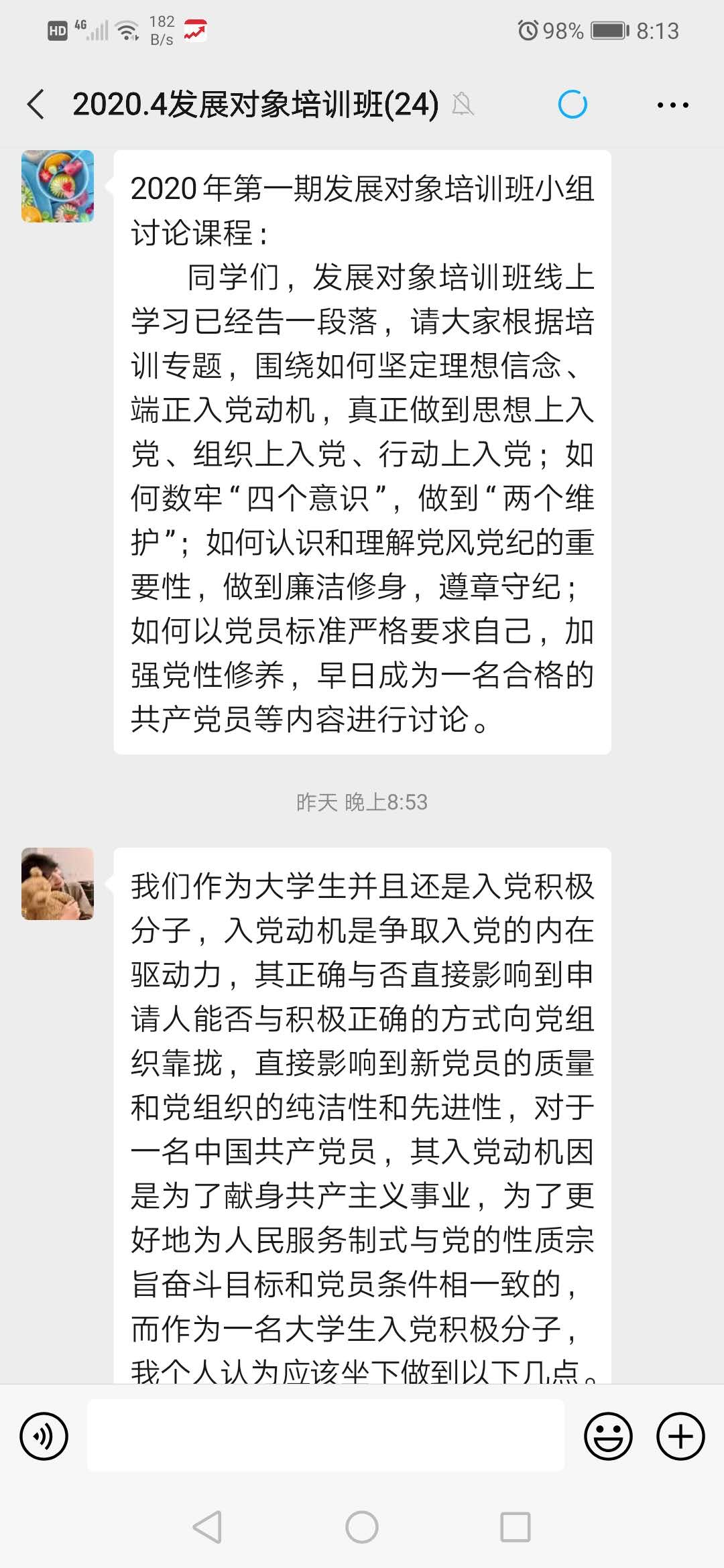 为了坚定理想信念、端正入党动机,真正做到思想上、组织上和行动上入党,按照学校党委2020年第一期发展对象培训班的通知要求,经济贸易学院于5月19日在微信群上开展了学习小组讨论课程。