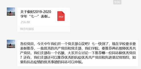 根据学校党委《关于做好2019-2020学年“七一”表彰推荐评选工作的通知》的文件部署,经济贸易学院教师第一党支部召开了支部会议进行专题研讨。疫情防疫期间,为避免人员聚集,本次会议采取线上微信群会议的形式进行讨论。经济贸易学院教师第一党支部书记廖晓虹主持召开了此次会议。经贸学院党总支书记李繁、党总支副书记龚云、办公室主任邓彩云、教师党员孙静、张笑、张家靖、陈中明出席了会议。
