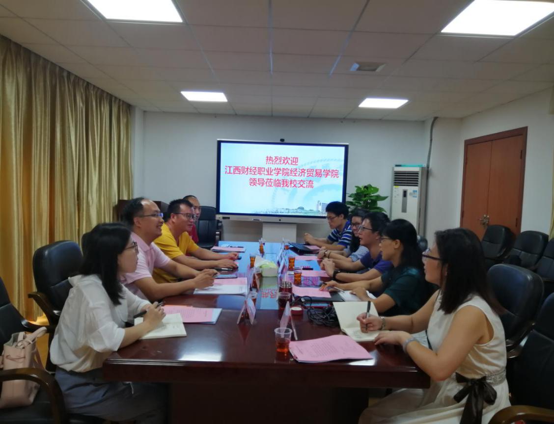 2020年8月7日上午,国家骨干高职院校、高水平专业群建设单位江西财经职业学院的经济贸易学院院长肖细根带领本院领导、老师、学生一行到我校经贸学院开展电子商务等专业人才培养模式、教学管理、课程建设、师资培养、学生创新创业教素质提升、学生能力培养等方面的交流研讨。学校党委委员、办公室吴浩主任热情接待了来宾。我校经济贸易学院院长邱秀芳、办公室主任邓彩云、学工办主任黄小奇、电子商务专业带头人方文超老师参加了会议。