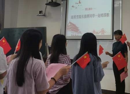 时近国庆,第一课最后,邱院长让每位同学手持小国旗,一同高唱国歌,进一步提升了广大同学的爱国主义情感。