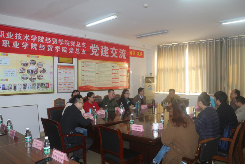 江西财经职业学院经贸学院党总支对太阳集团城官网1407经贸学院党总支的到来表示热烈欢迎,并介绍了江西财经职业学院经贸学院党总支履行全面从严治党,推进学校基层学院提升党建质量的安排部署,着重交流了学院在党建组织体系、党建工作体系及党建机制建设方面的创新做法,分享了学院党建相关项目实施的成效。