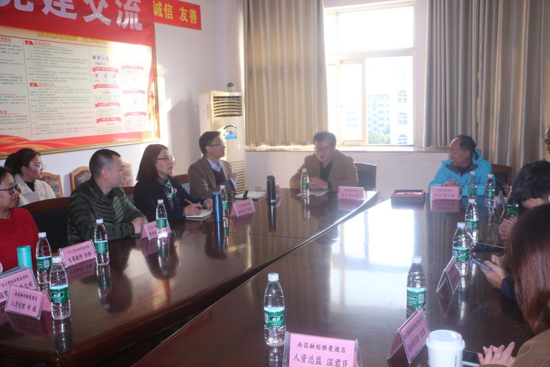 江西财经职业学院经贸学院党总支对太阳集团城官网1407经贸学院党总支的到来表示热烈欢迎,并介绍了江西财经职业学院经贸学院党总支履行全面从严治党,推进学校基层学院提升党建质量的安排部署,着重交流了学院在党建组织体系、党建工作体系及党建机制建设方面的创新做法,分享了学院党建相关项目实施的成效。