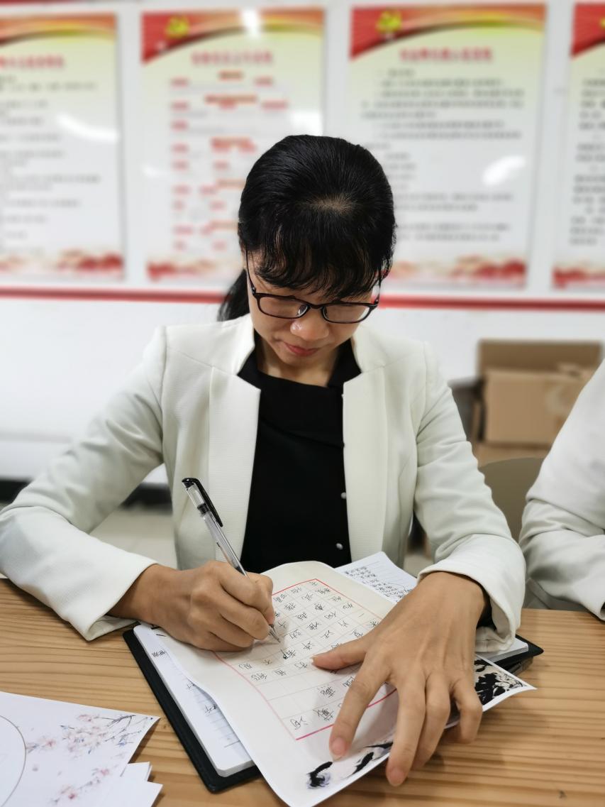 书写现场老师们认真研读,专心撰写,并且分享了诗词的主要内容和学习心得。在体验中华汉字结构造型之美、感受中华文化博大精深的同时,大家也重温了红色诗词的深邃意境,深刻领悟到今天的幸福生活来之不易,更加坚定了“不忘初心、牢记使命”的决心,努力为人民谋幸福,为民族谋复兴。
