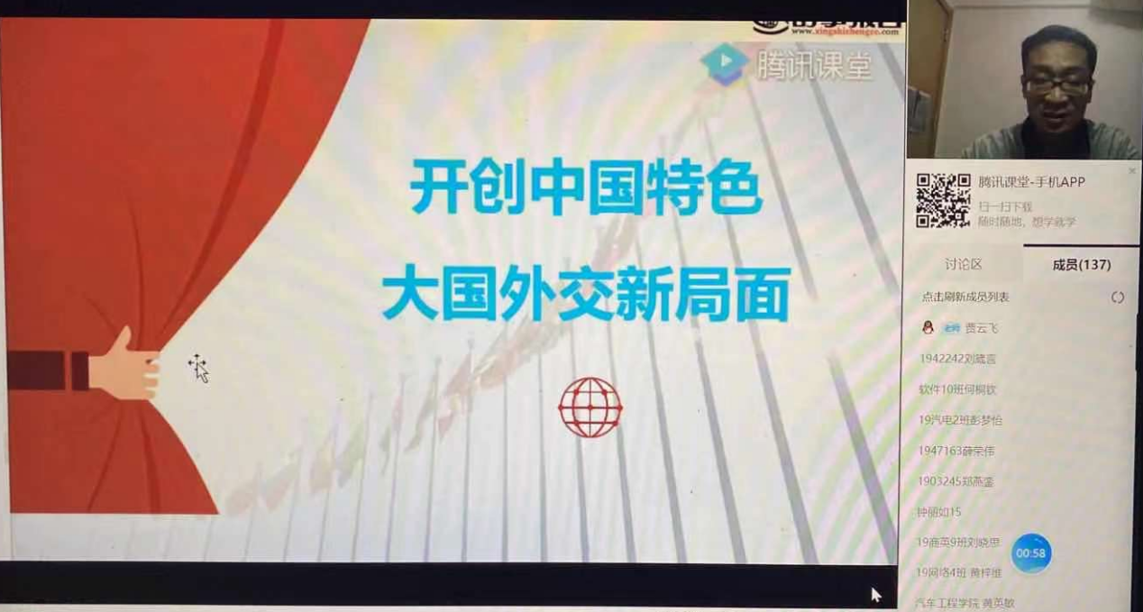 为使学员更好的了解新时代中国外交,深刻把握习近平外交思想。4月25日晚,马克思主义学院贾云飞老师在腾讯课堂为发展对象讲授《开创中国特色外交新局面》。