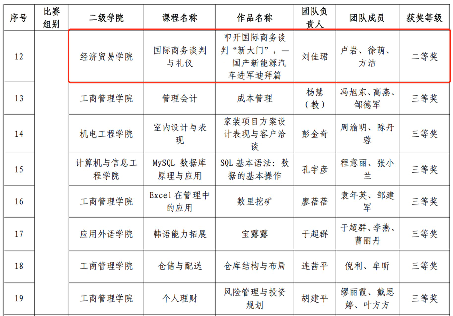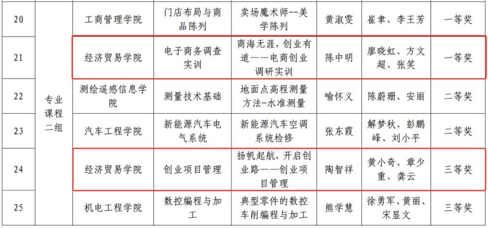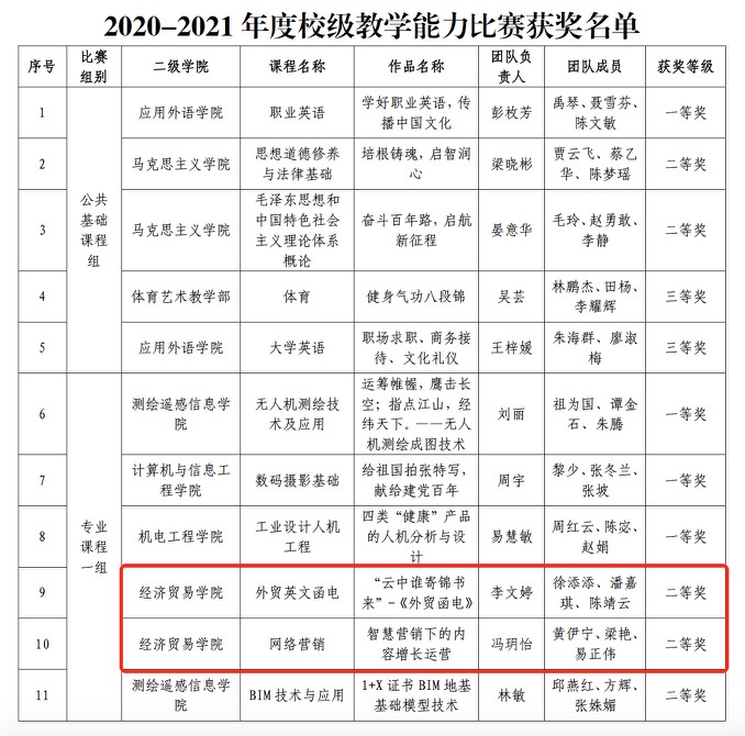 本次比赛,经过院内选拔,经贸学院共有五支队伍参加专业课程一组及专业课程二组的角逐。根据校级网络初评,经贸学院硕果累累。其中,在专业课程一组中,李文婷老师带领的“云中谁寄锦书来”——《外贸函电》、冯玥怡老师带领的《智慧营销下的内容增长运营》及刘佳珺老师带领的《叩开国际商务谈判“新大门”——国产能源汽车进军迪拜篇》均荣获二等奖。在专业课程二组中,陈中明老师带领的《商海无涯,创业有道——电商创业调研实训》荣获一等奖,陶智祥老师带领的《扬帆起航,开启创业路——创业项目管理》荣获三等奖。获得校级一、二等奖的四支队伍将代表学校,推荐参加2021年的省级教学能力比赛。