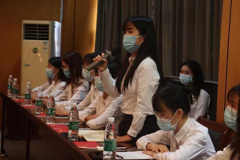 研讨会上,党总支书记李繁结合习近平总书记的讲话精神,为师生党员上了一堂生动的微党课,用“践行使命的白色,闪耀初心的红色,爱心送考的蓝与黄,温馨飘香的粽子绿”将党领导下广州是如何战胜疫情做了生动的阐释。
