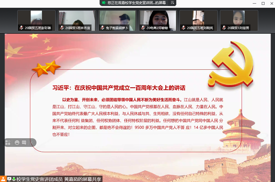 为了学习贯彻习近平总书记在庆祝中国共产党成立100周年大会上的重要讲话精神,立足中国共产党百年华诞的重大时刻和“两个一百年”历史交汇的关键节点。8月31日晚,太阳集团城官网1407学生党史宣讲团成员黄嘉茹同志给20电商2班团支部和20国贸5班团支部开展了线上党史专题宣讲,宣讲通过腾讯会议的方式,以“团结统一,众志成城”为主题,带领学生们共同回顾党史小片段以及学习习近平总书记在建党100周年大会上的重要讲话精神。